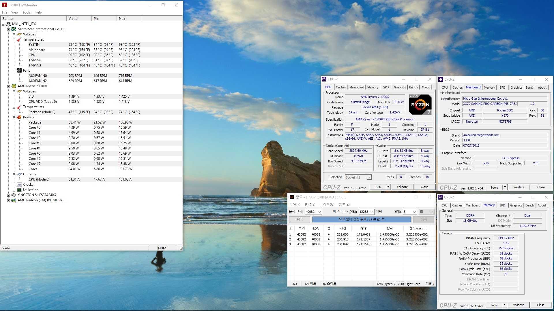 Для максимальной загрузки процессора AMD Ryzen 7 1700X применялась утилита LinX 1.0.0K (3 прогона, 12 Гбайт, время выполнения ~17 минут). Потребление системы в простое составило 102 Вт, под нагрузкой — 280 Вт. На момент тестирования температура в помещении находилась на уровне 25,4 °С.