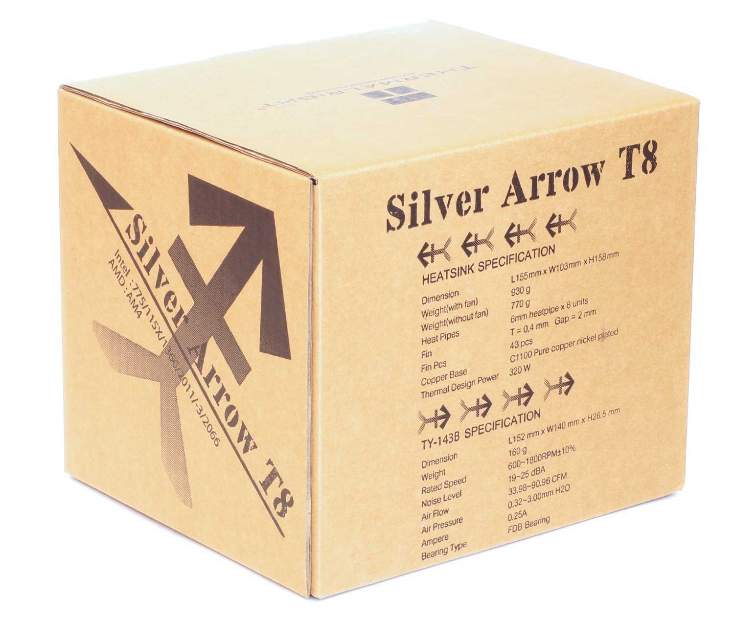 Дизайн «серебряной стрелы» хорошо узнается в кулере Thermalright Silver Arrow T8, хотя он оснащается только одним 140 мм вентилятором. Вместе с темкулерпо-прежнемусмотрится солидно и эффектно, позволяя отводить до 320 Вт тепла от процессоров с сокетами AMD AM4/Intel LGA775/115x/1366/2011(-3)/2066. Для сокета AMD TR4 производительчуть ранеевыпустил другую модель Thermalright Silver Arrow TR4.