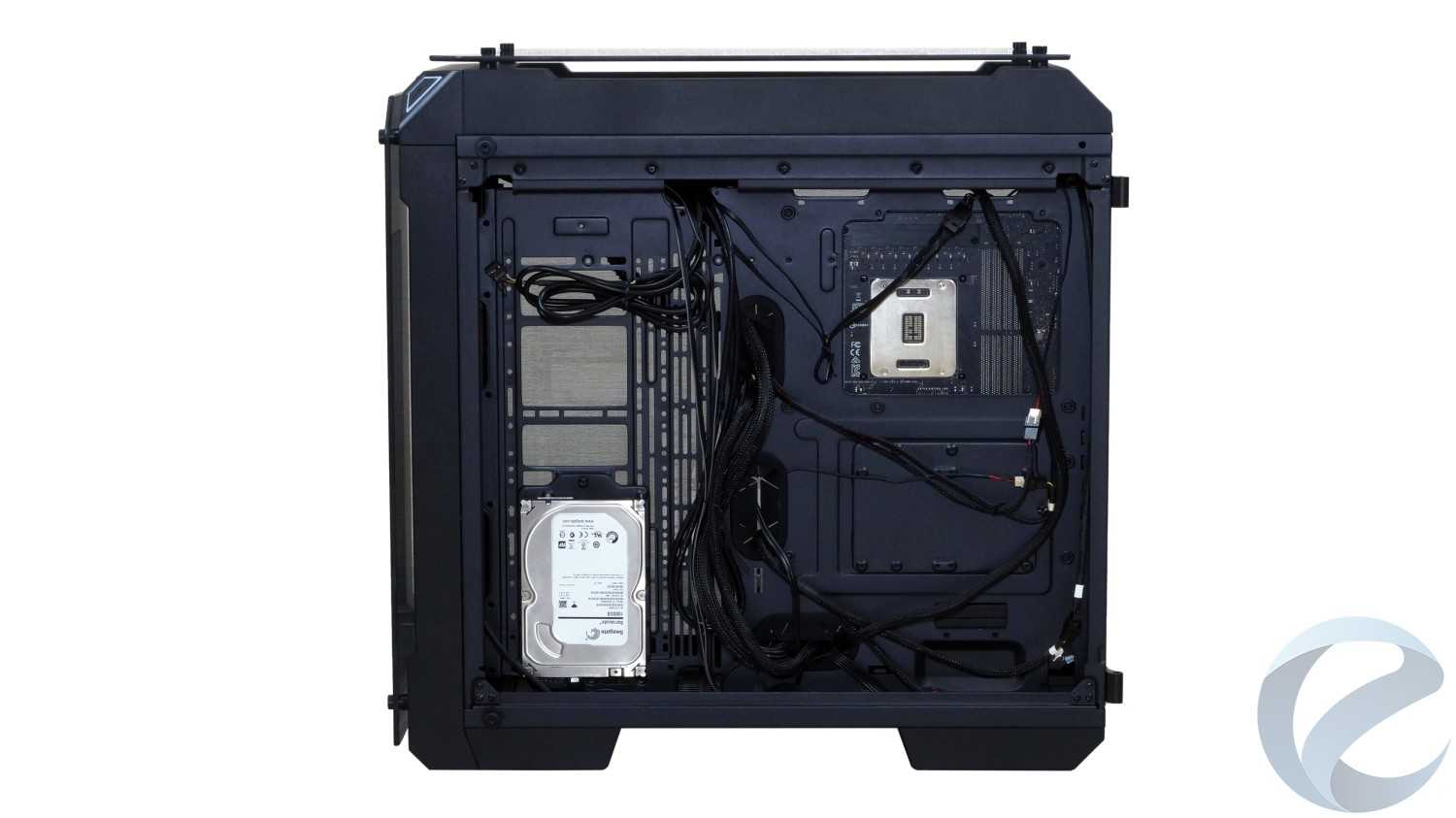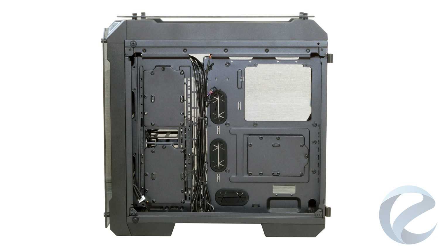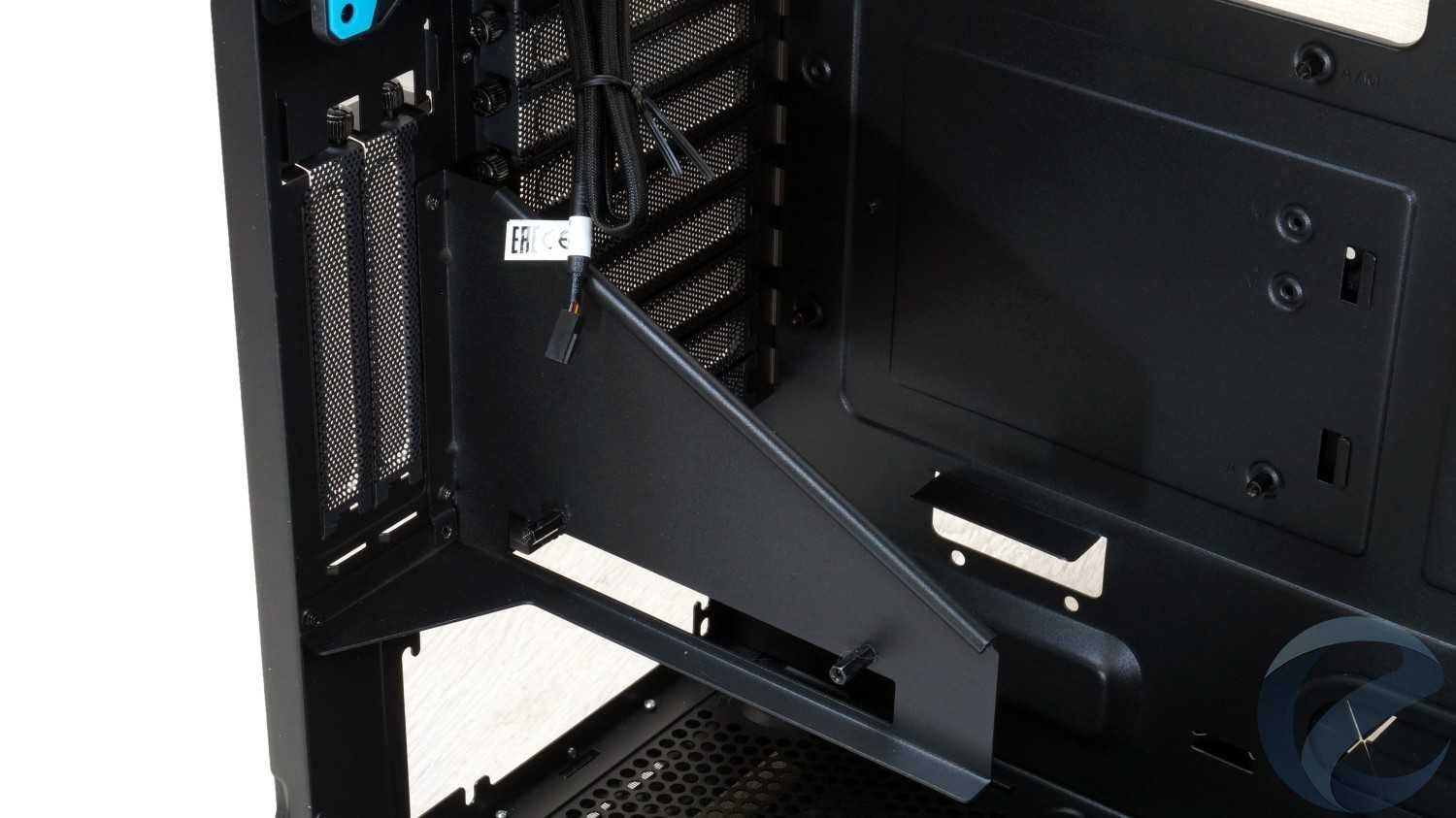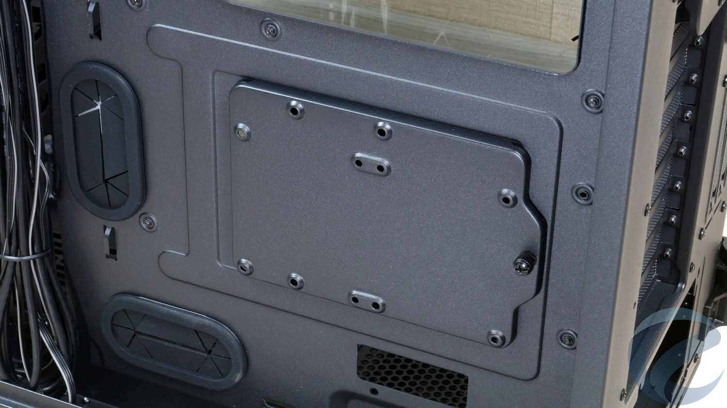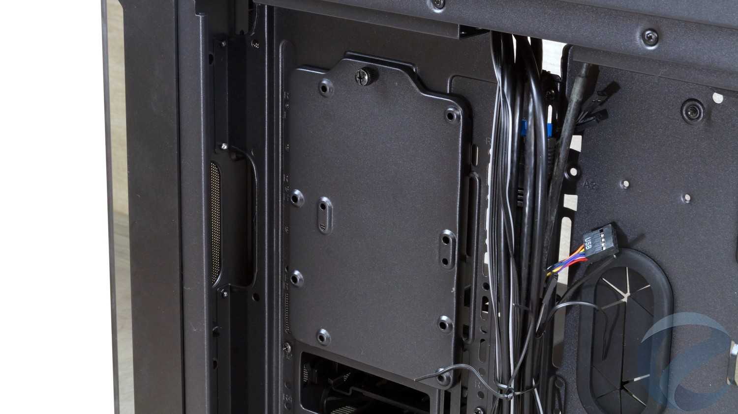 Любопытныхсюрпризов за поддоном нет:3 съемные металлические пластины, на каждую из которойможно зафиксировать два 2,5″ или один 3,5″ накопитель. В случае, если вы решите установить радиатор параллельно поддону, то от 2 из них придется отказаться. Такой вариант, конечно, может кому-то и придется по вкусу, но, наш взгляд, это — не самый оптимальный способ размещения СЖО. А что, несомненно, радует,так это 40 мм свободного пространства для организации аккуратного кабель-менеджмента.