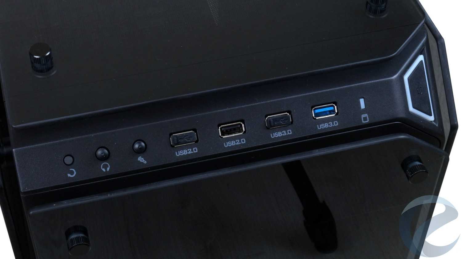 Панель ввода-вывода находится в верхней части фронтальной панели. Размещение на скошенной гранисчитаем удачным, кнопкии разъемы легкодоступны. Каждый разъем закрыт съемной резиновой заглушкой. Перечислим слева направо элементы панели ввода-вывода: кнопка«Reset», разъемы HD Audio, 2 × USB 2.0, 2 × USB 3.0, индикатор активности накопителей (красная подсветка) и кнопка«Power» (белая подсветка).