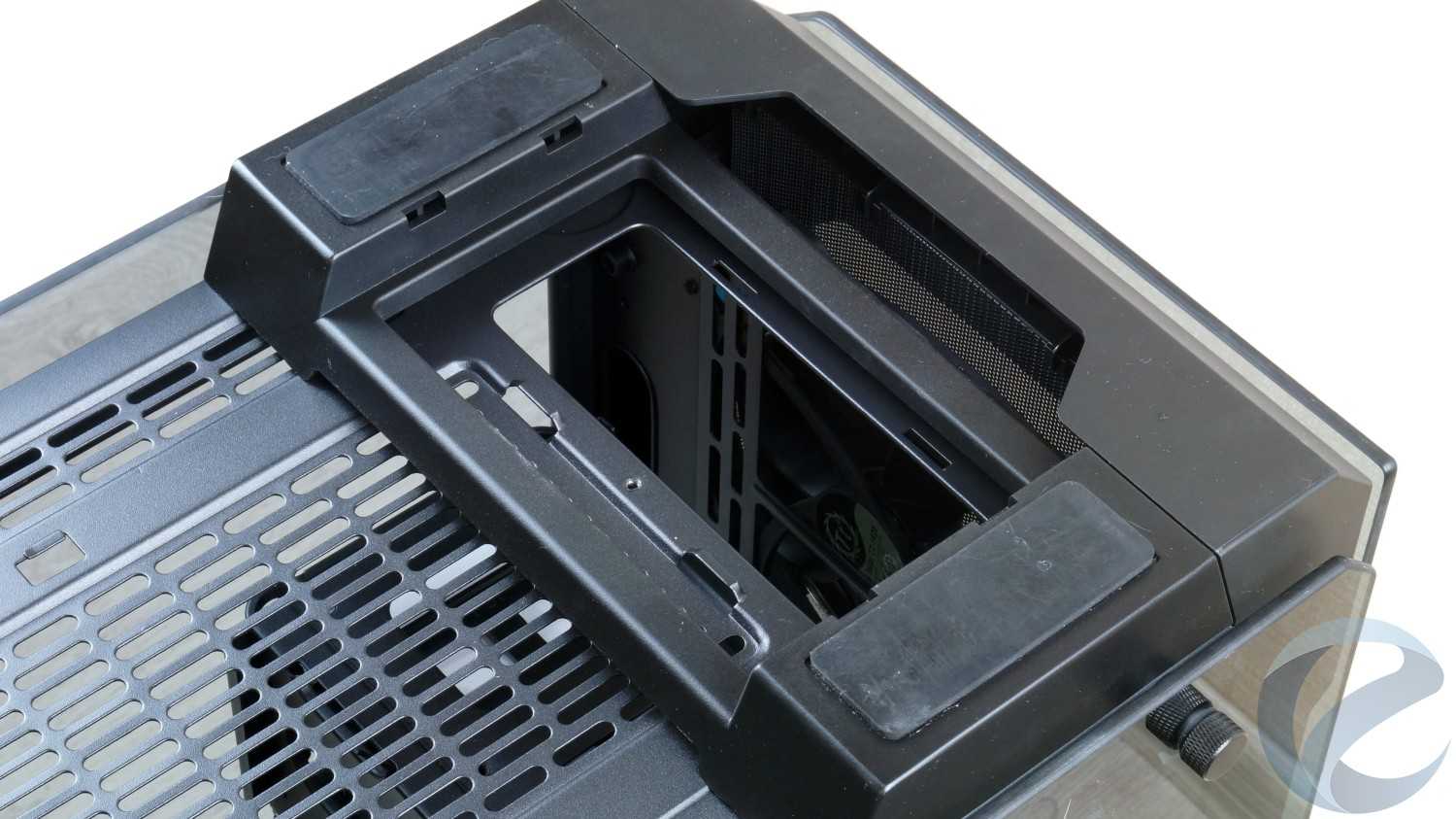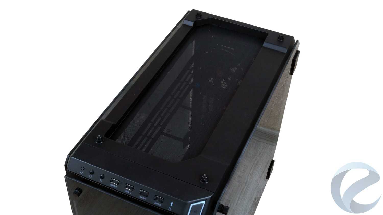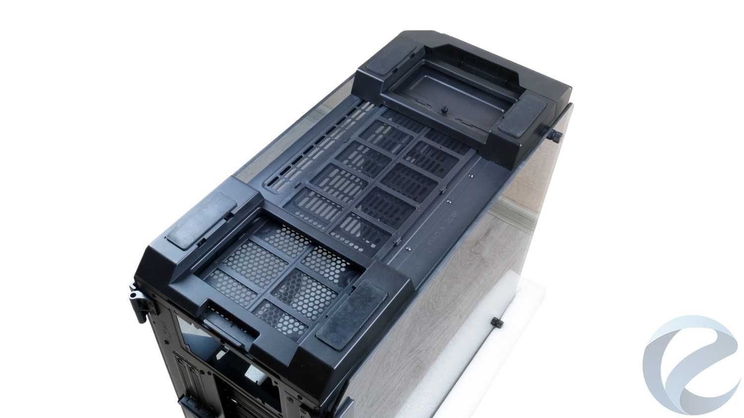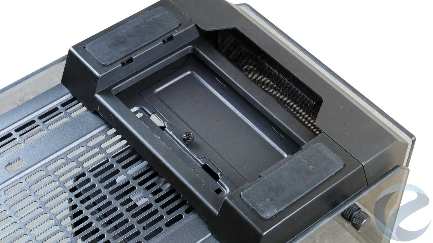 Верхняя часть корпуса по своему устройству схожа с фронтальной. Сначала нас ждет стеклянная панель, зафиксированная 4 винтами с накатанной головкой. За ней находится пластиковый элемент с противопылевым фильтром, а под ним — металлическая рамка крепления радиаторов СЖО/вентиляторов. Так как рамка съемная,процесс монтажа деталей СЖО значительно упрощается, а возможность её размещения в двух положениях позволит использовать более толстые теплообменники, не беспокоясь о возможной несовместимости с высокими модулями оперативной памяти.