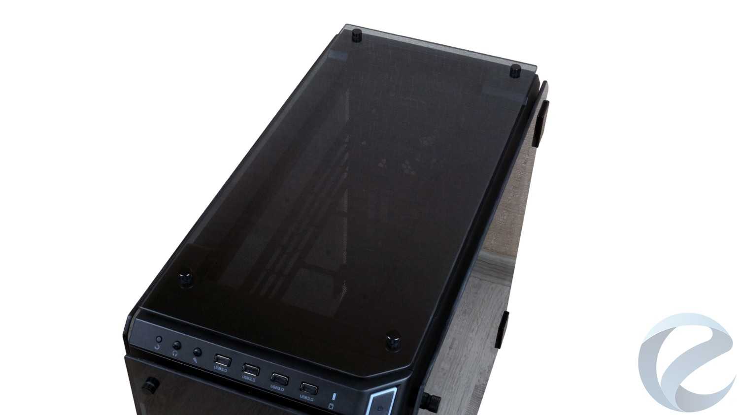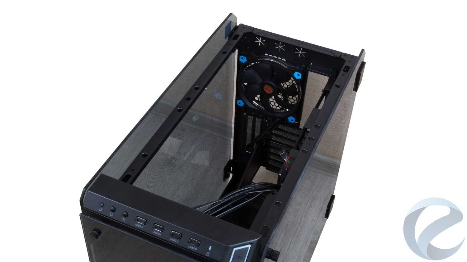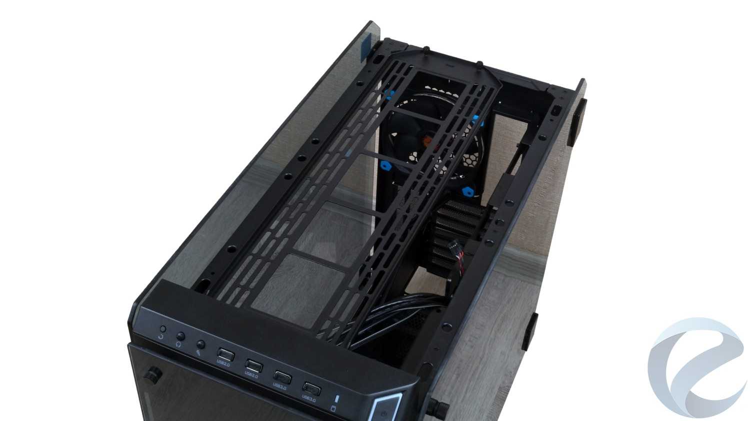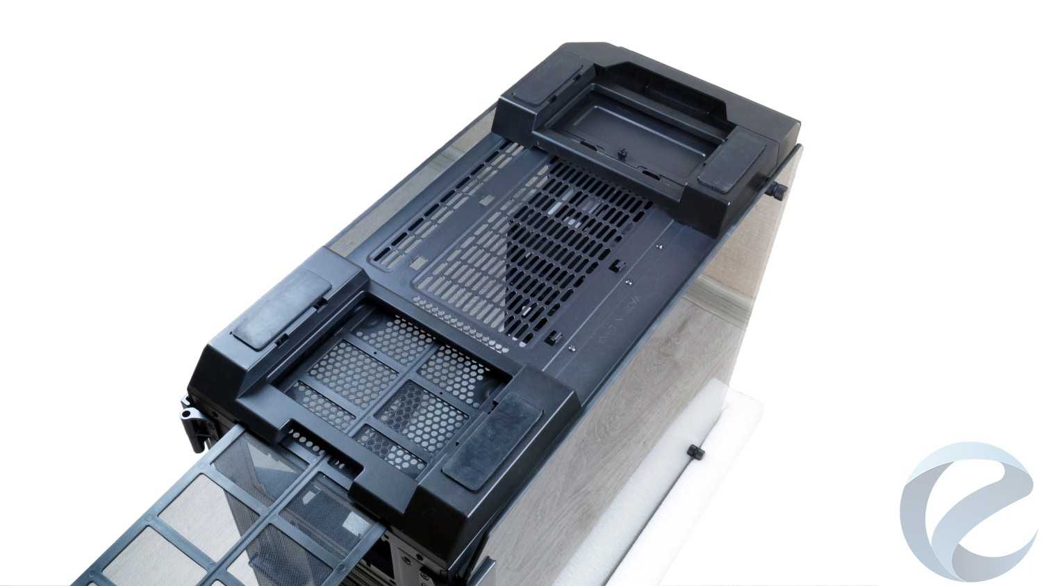 Верхняя часть корпуса по своему устройству схожа с фронтальной. Сначала нас ждет стеклянная панель, зафиксированная 4 винтами с накатанной головкой. За ней находится пластиковый элемент с противопылевым фильтром, а под ним — металлическая рамка крепления радиаторов СЖО/вентиляторов. Так как рамка съемная,процесс монтажа деталей СЖО значительно упрощается, а возможность её размещения в двух положениях позволит использовать более толстые теплообменники, не беспокоясь о возможной несовместимости с высокими модулями оперативной памяти.