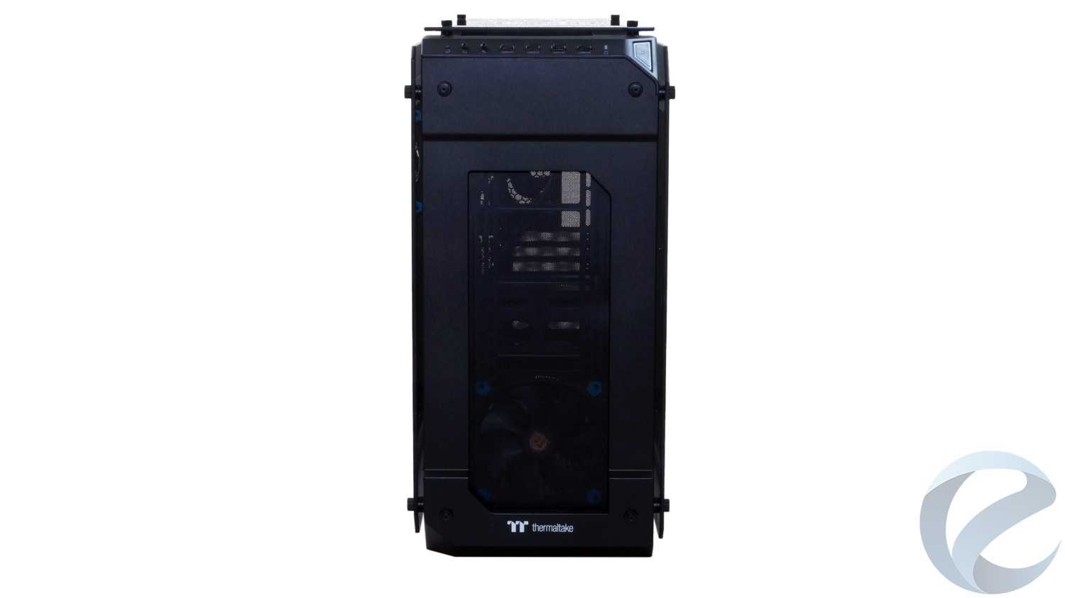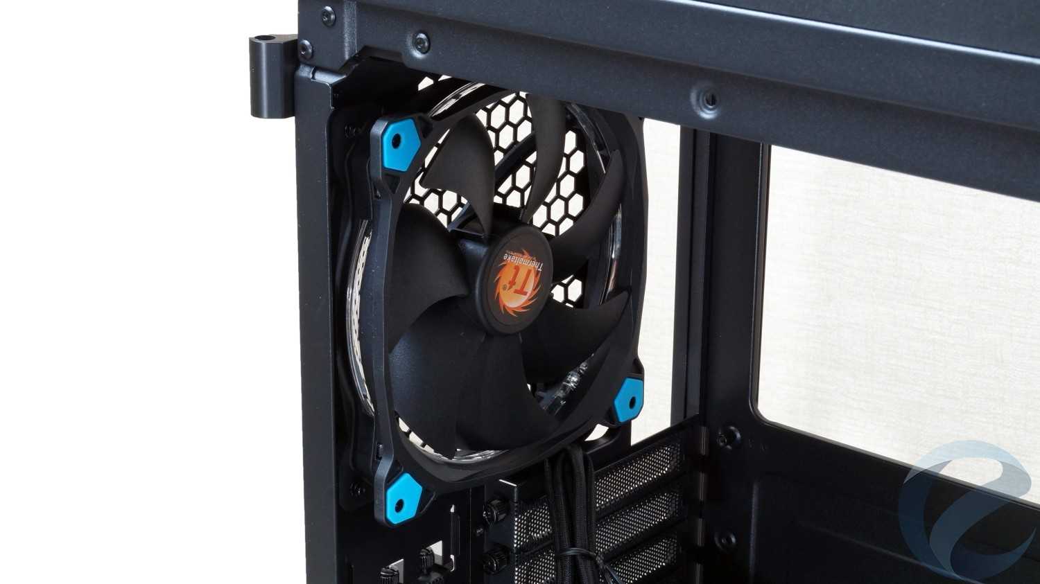 На задней стенке размещен еще один 140 мм вентилятор Thermaltake Riing 14 LED Blue. 2 дополнительныхслота расширения и съемное металлическое крепление позволяют установить видеоускоритель в вертикальном положении. Возможность есть, и это, конечно, радует, новот специального PCIe удлинителя (райзер/riser) в комплекте, к сожалению, нет. Странно, что Thermaltake не укомплектовала топовый корпус линейки Viewданным устройством.Заглушки слотов расширения съемные, каждая фиксируется винтом с накатанной головкой.