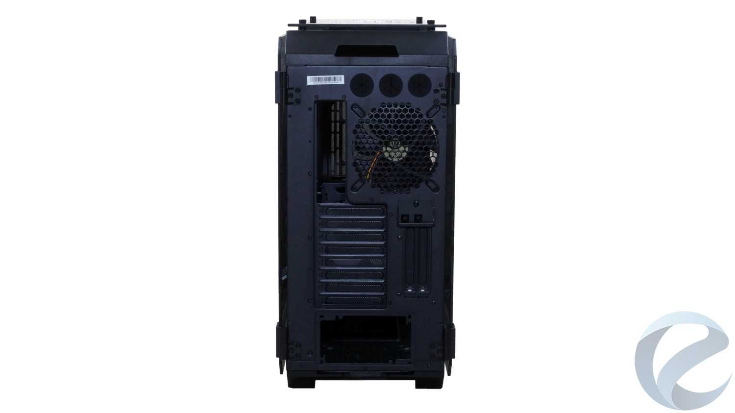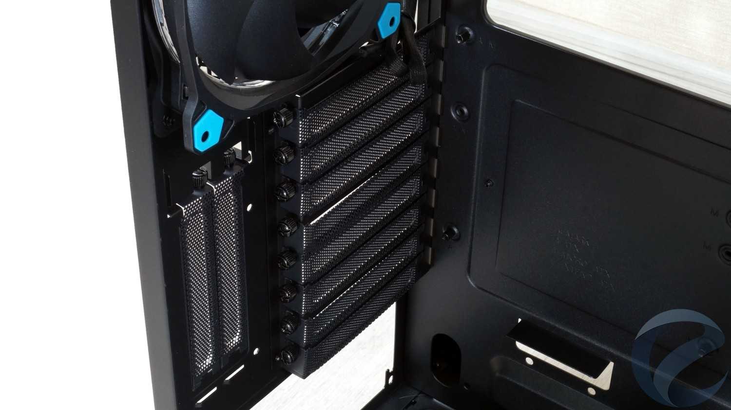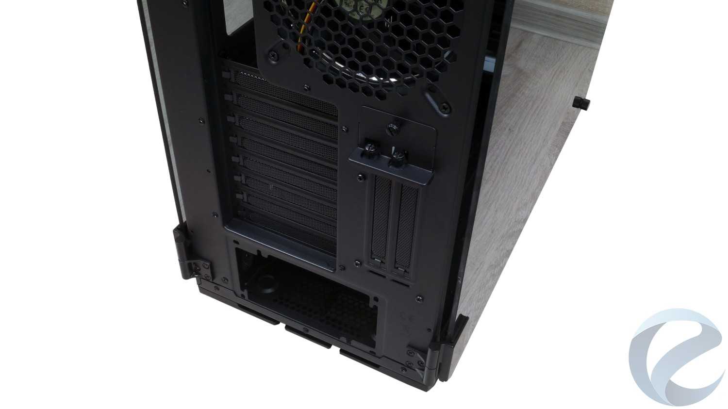 Обратная сторона корпуса выглядит более привычно. Перечислим элементы сверху вниз: отверстия для шлангов СЖО, место установки 120 / 140 мм вентилятора, 8 горизонтальных и 2 вертикальных слота расширения, место установки блока питания.