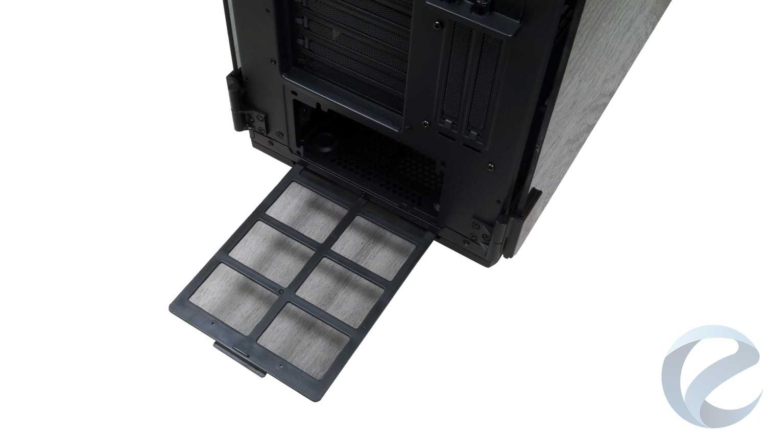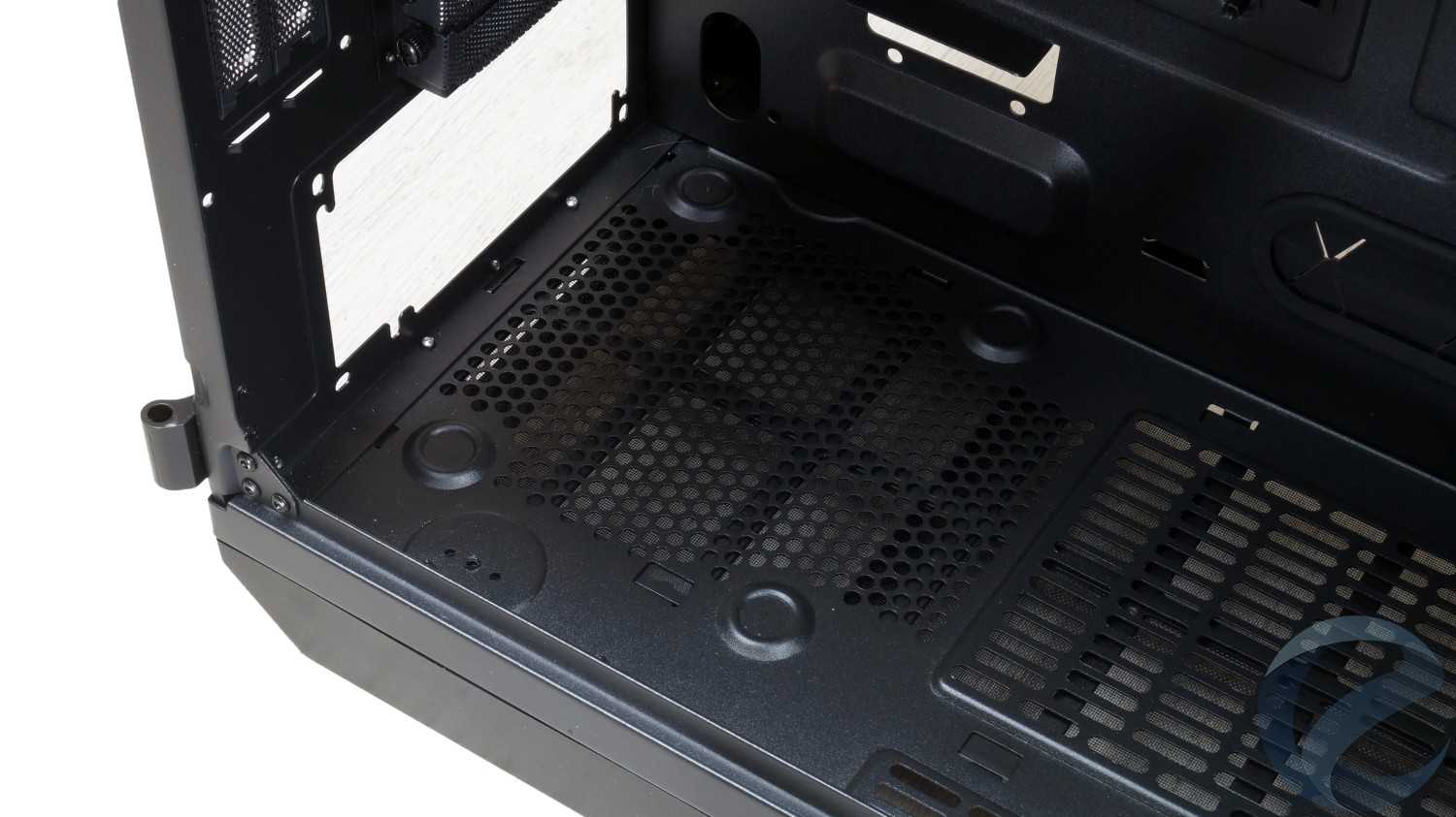 Устойчивость корпуса на поверхности обеспечена 4 резиновыми площадками. Большая часть площади закрыта съемным противопылевым фильтром. Сделано это не просто так, на дне корпуса при желании также можно разместить вентиляторы или радиатор СЖО длиной до 240 мм.