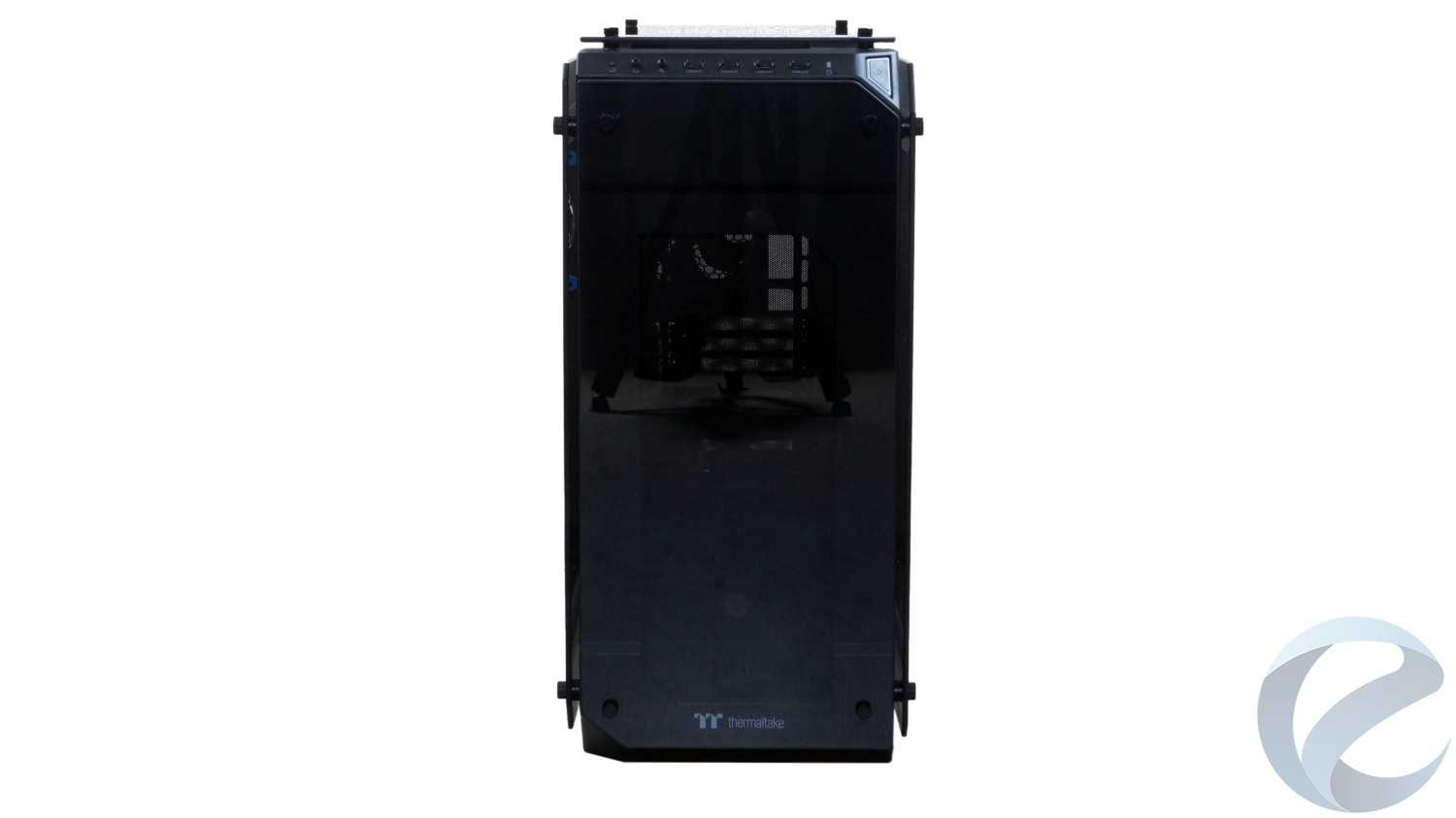 Начнем с фронтальнойпанели. Прикрывает «лицо» View 71 TG Edition панель из затемненного закаленного стекла. Фиксируется она4 винтами с накатанной головкой. За ней расположена съемная пластиковая панель с мелкоячеистым противопылевым фильтром. Снимаем еще «слой» и видимметаллическое шасси. На лицевой части корпуса можно разместить радиаторы СЖО длиной до 420 мм или 3× 120 /2× 140 вентилятора. Один из 2 предустановленных вентиляторовThermaltake Riing 14 LED Blue размещен спереди.