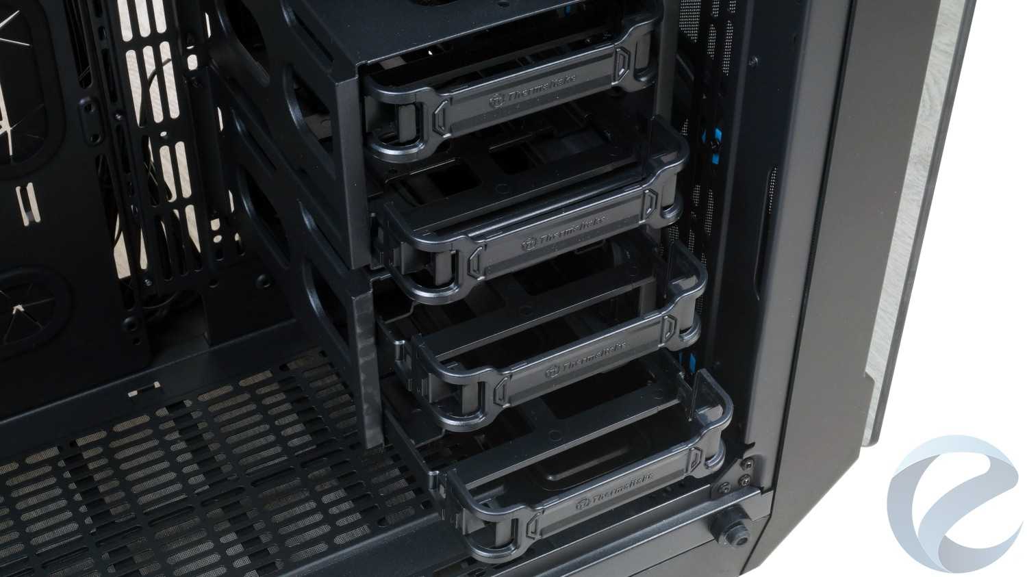 Место установки блока питания оборудовано 4 прорезиненными демпферами. Съемных корзин для установки накопителей в основном отсеке 2. Каждая из них вмещает два 2,5″ или 3,5″ устройства. В случае, если вы можете ограничиться двумя 2,5″ или одним 3,5″ накопителем, то корзины можнодемонтировать и установить на их местерадиатор СЖО длиной до 420 мм.