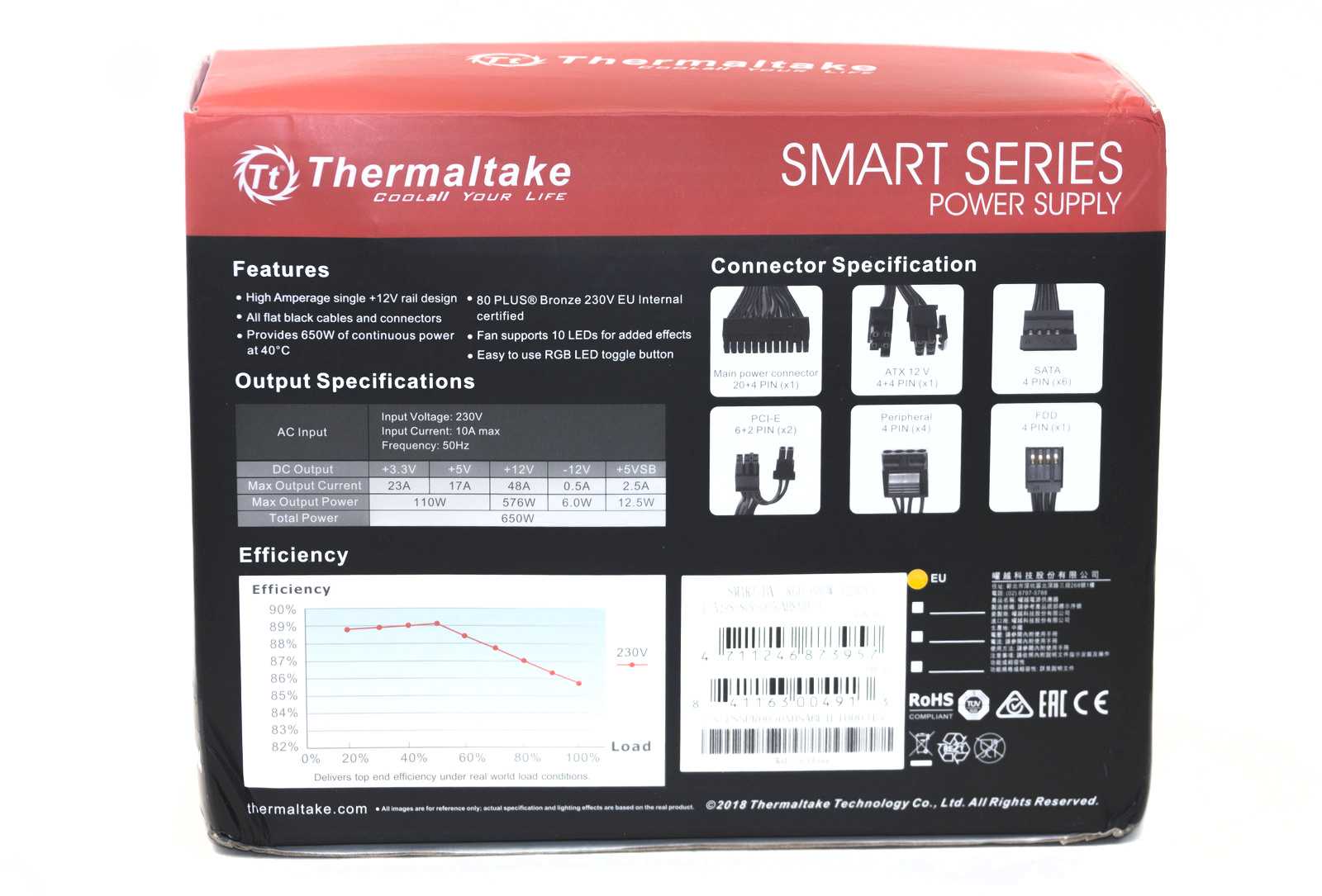 Thermaltake Smart BX1 RGB 650W – обычный бюджетный блок с некоторыми положительными чертами, которые выделяют его из массы подобных ему по электрическим характеристикам. В плюсы можно выделить длинные кабели, интересный дизайн корпуса и подсветку. Ну и наличие одного (зато самого большого) японского конденсатора тоже сложно назвать минусом.