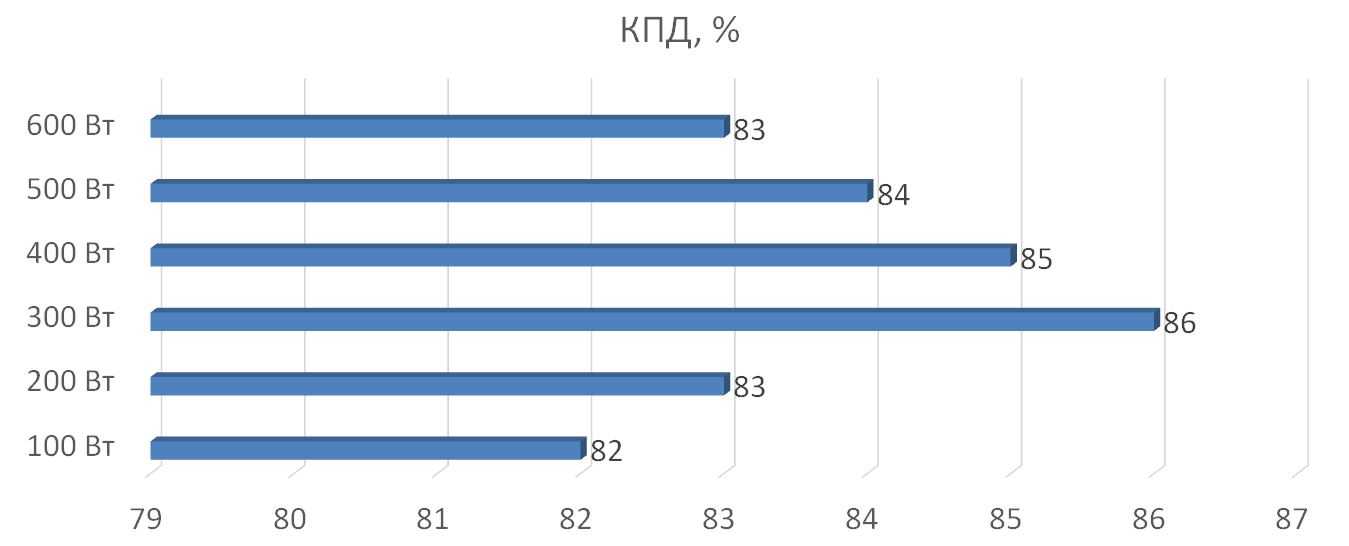 Уровень КПД полностью соответствует стандарту 80 PLUS Bronze, максимальные 86% демонстрируются при нагрузке в диапазоне от 200 до 300 Вт.
