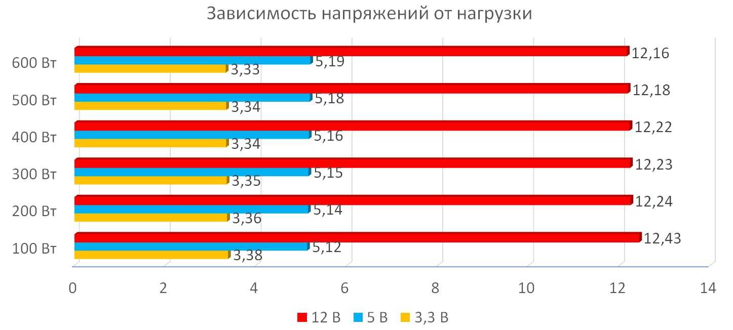 Тестовый стенд позволяет нагружать линию +12 В с шагом в 100 Вт. Линии +3.3 В и +5 В подключались к постоянной нагрузке в 50 Вт, что является типичной нагрузкой на них в реальной системе.