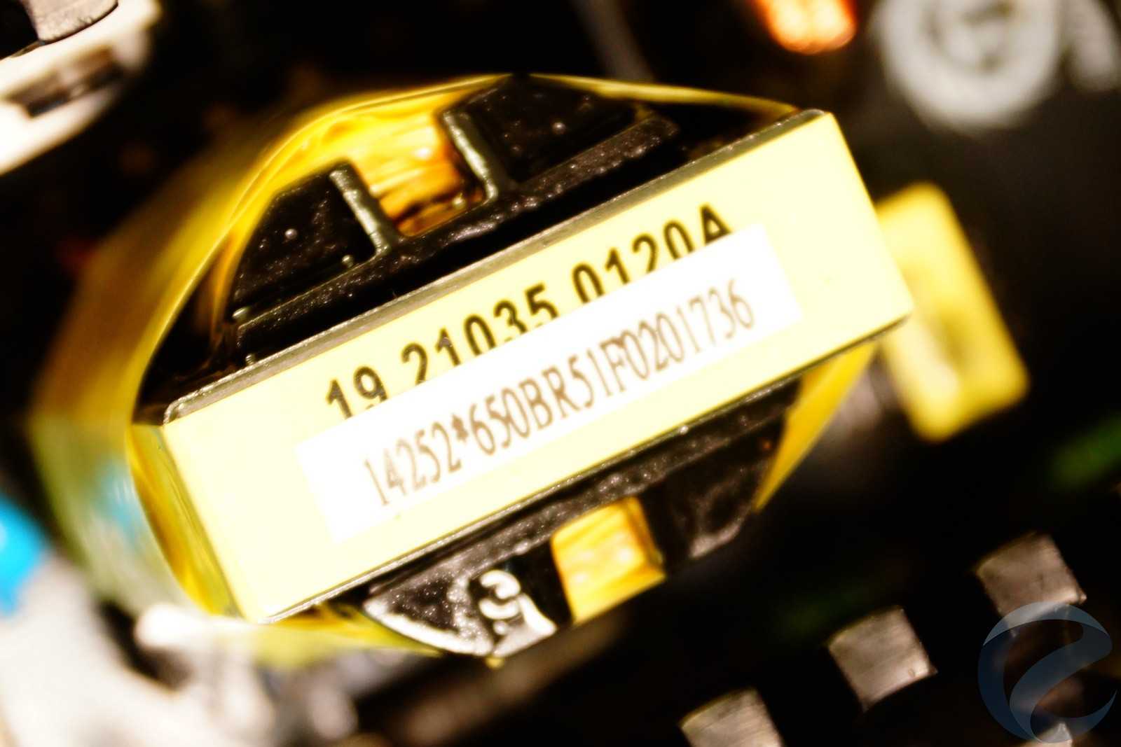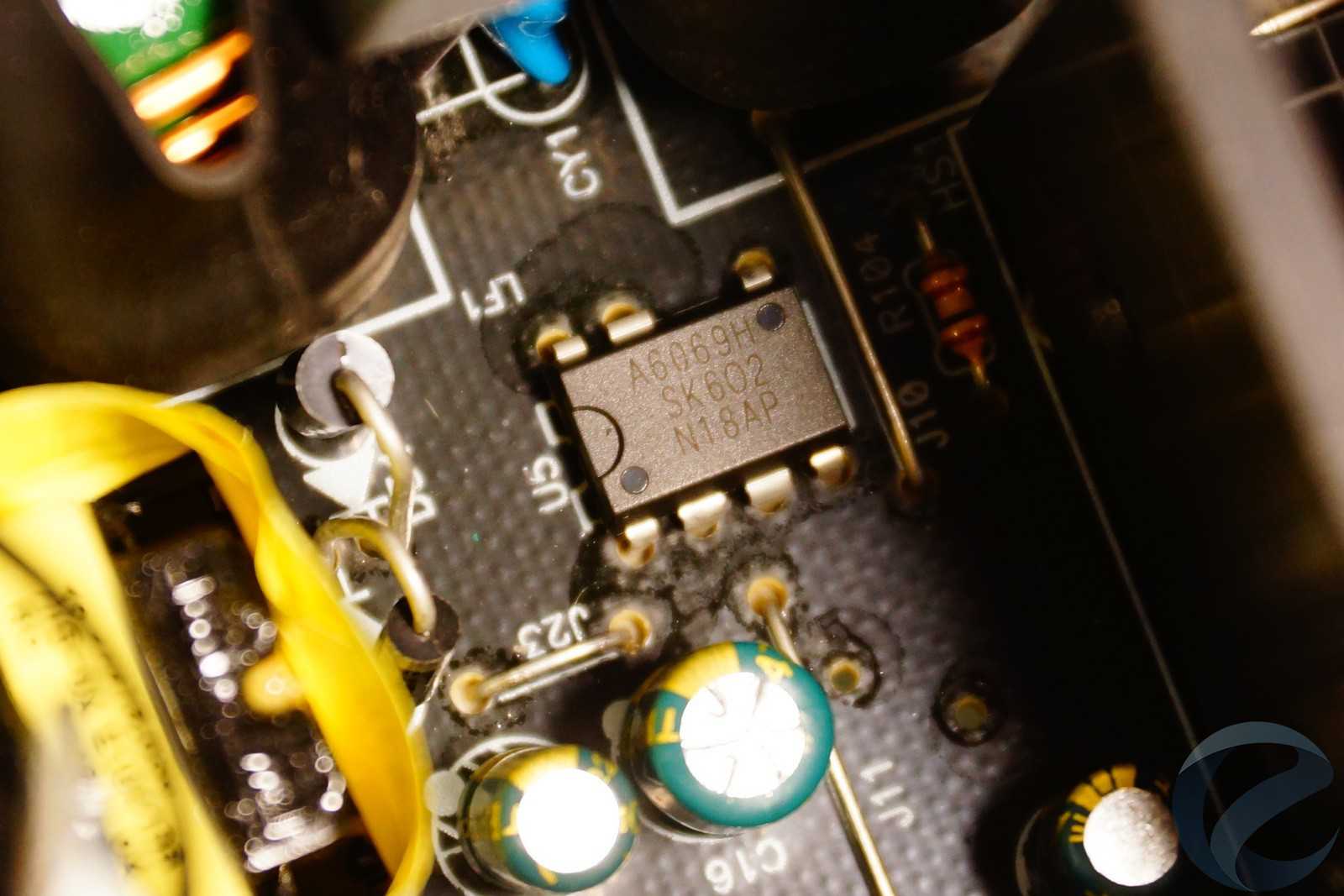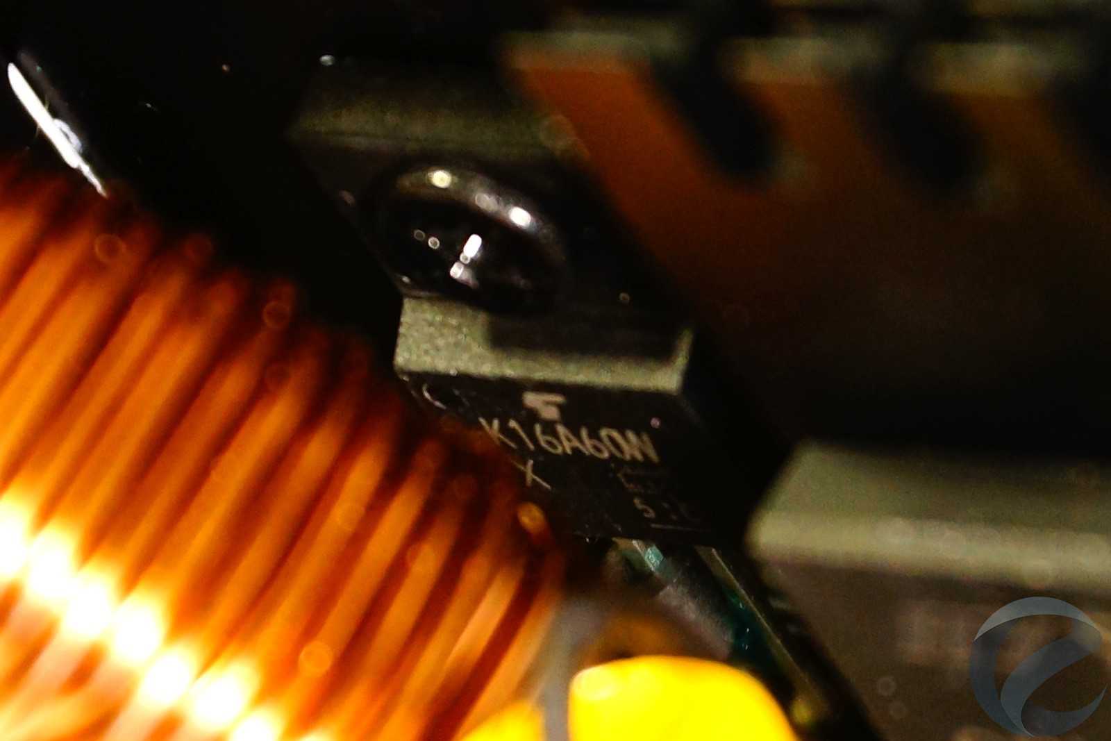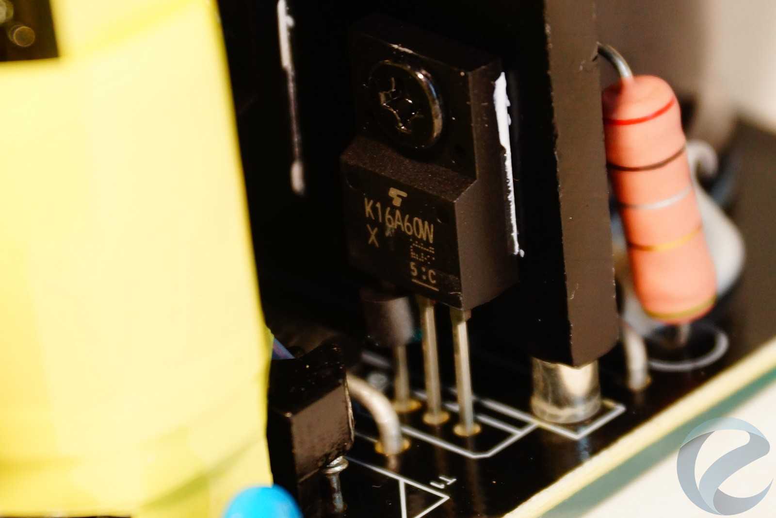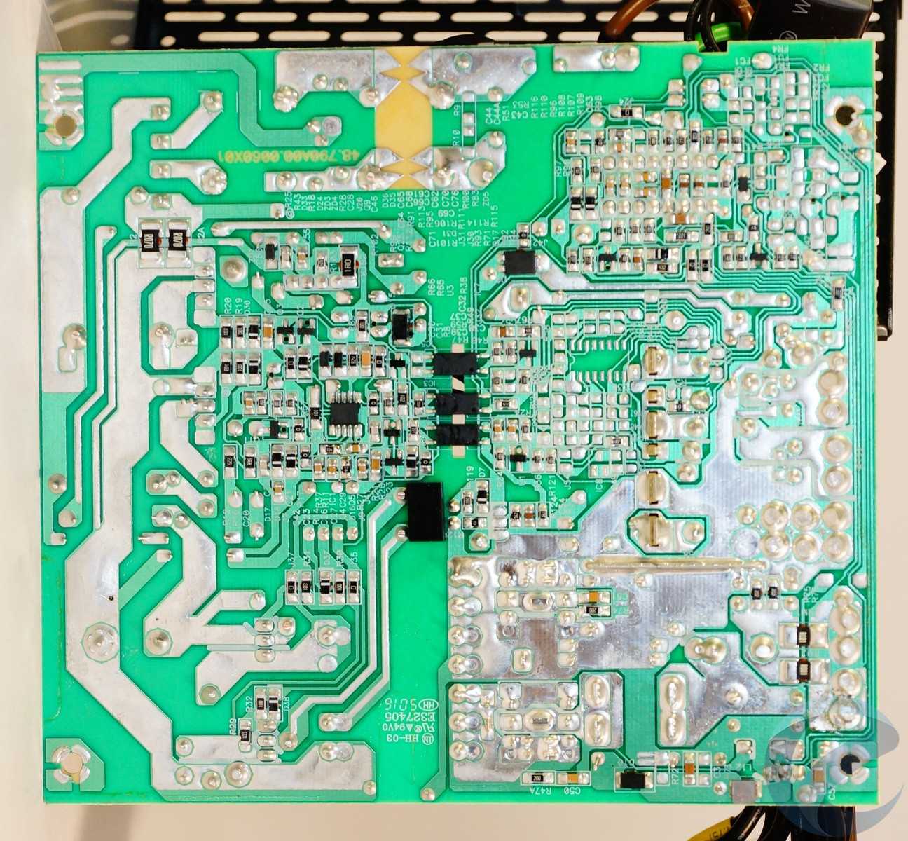 На краю платы располагается APFC преобразователь, дроссель без кожуха или термоусадки. Корректор работает на основе двух транзисторов K16A60W и диода IDH06G65C5, расположенных с одной стороны радиатора. На другой стороне радиатора — пара транзисторов первичного преобразователя K16A60W. Микросхема CM6805BC, отвечающая за работу преобразователя и корректора, распаяна с обратной стороны печатной платы.