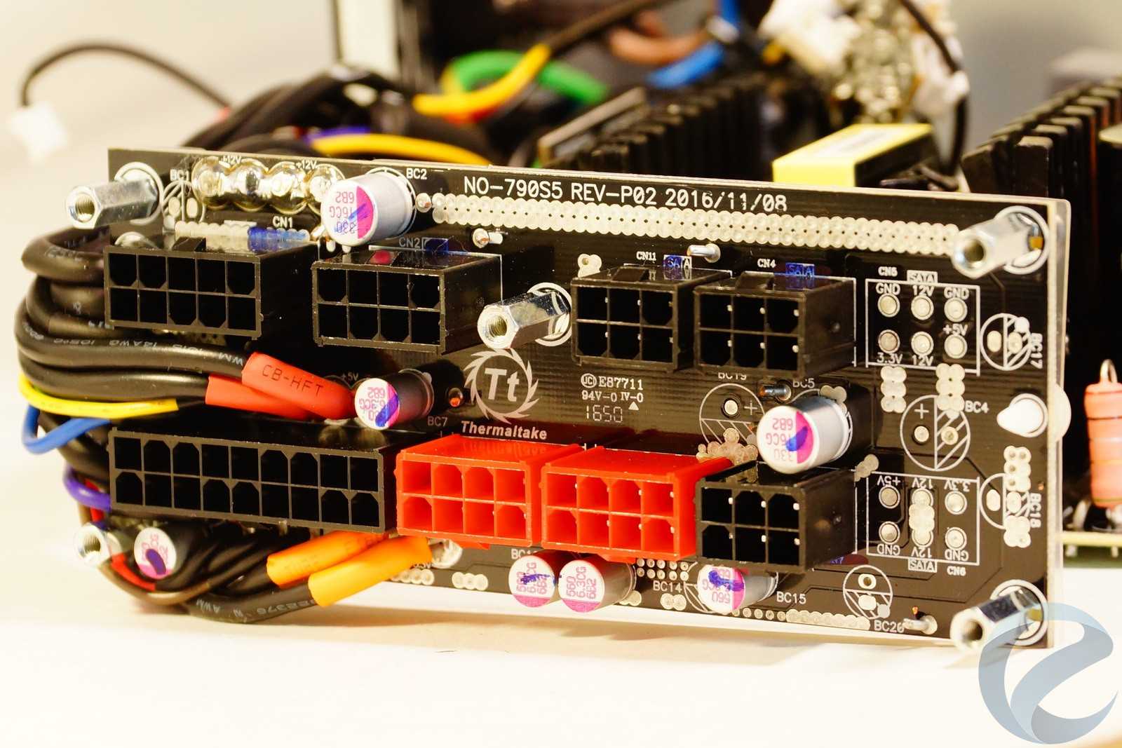 Thermaltake Smart Pro RGB 650W основан на популярной схеме прямоходового преобразователя. Из особенностей схемотехники можно отметить DC-DC преобразователь во вторичной цепи для линий +3,3 В и +5 В. Для канала +12 В, используется выпрямитель на диодных сборках.