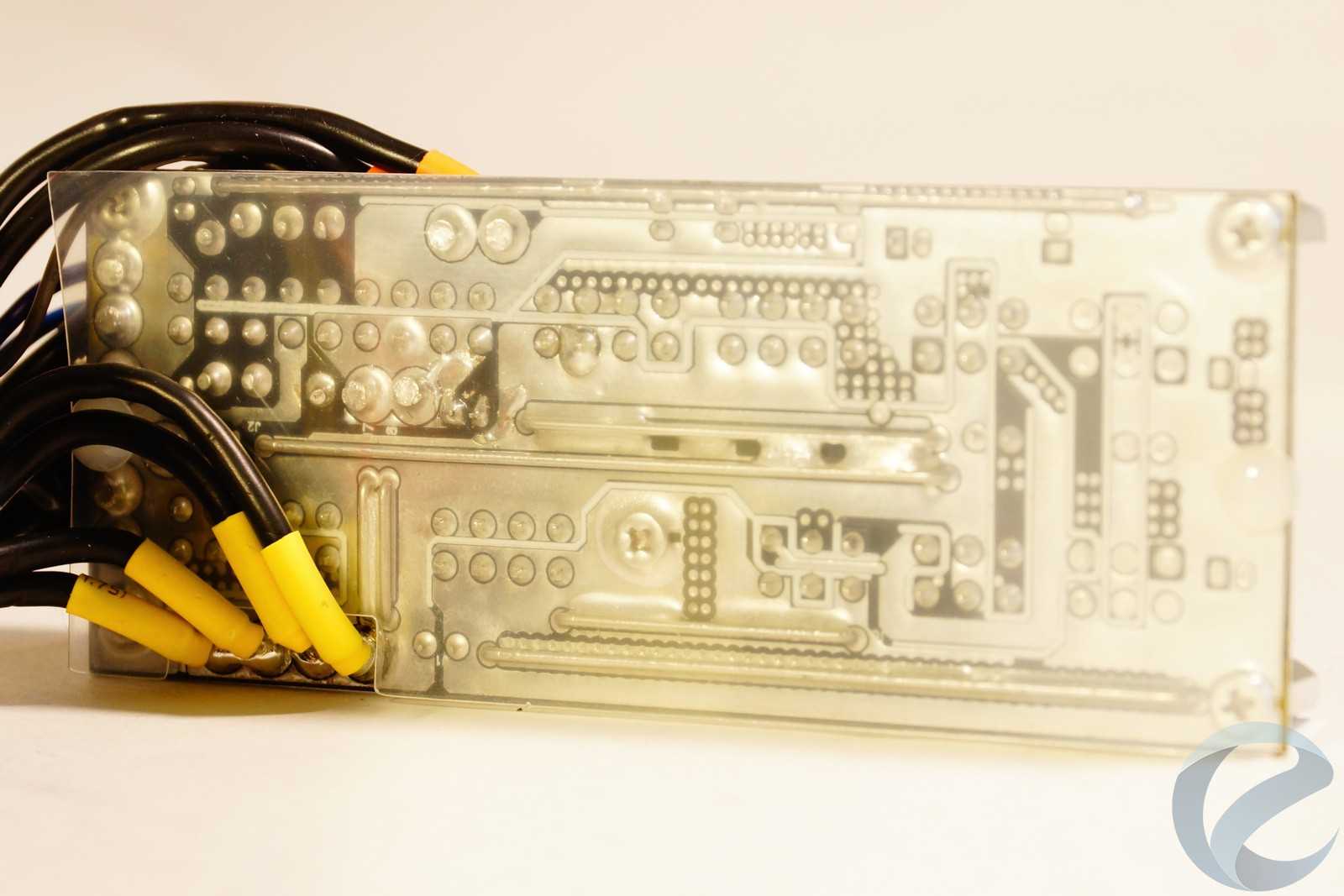 Еще несколько полимерных конденсаторов находятся на плате с разъемами, они дополнительно фильтруют пульсации. С обратной стороны мы видим дорожки, усиленные припоем, и защитный пластиковый экран.