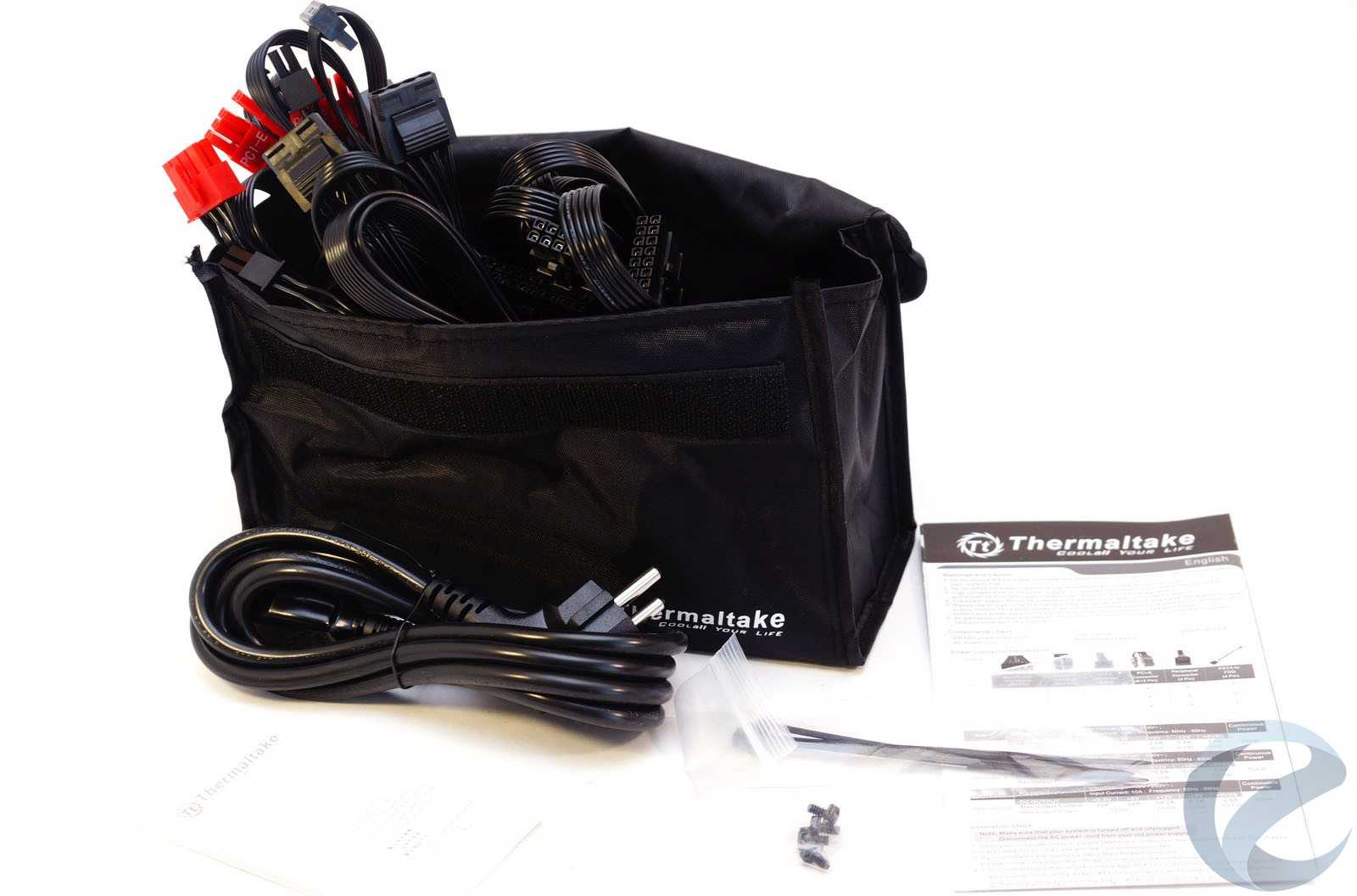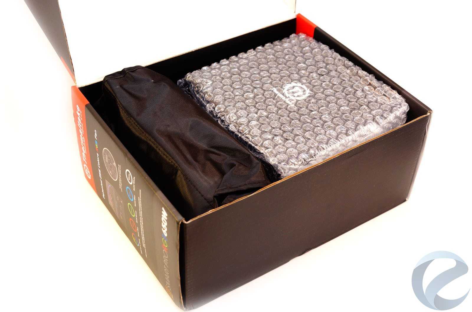 В коробке находится сам блок питания, упакованный в пупырчатую пленку и тканевая сумка с комплектом кабелей. На дне коробки находится полиуретановая прокладка. Для надежности транспортировки не лишнейтакая же прокладкабыла бы и сверху.