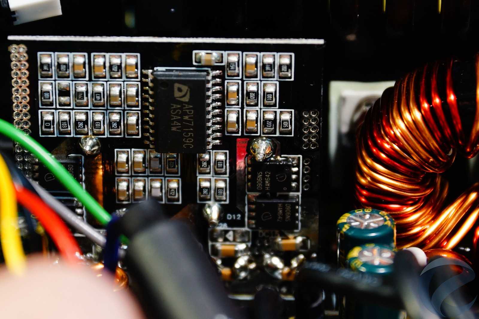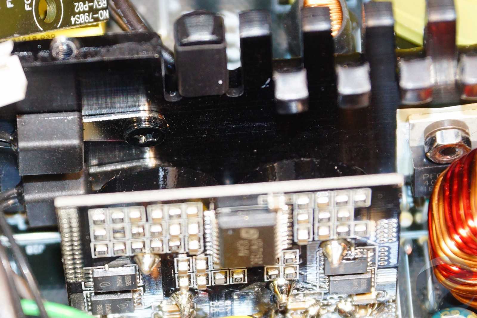 За радиатором находится дроссель 12 В канала и вертикальная плата с DC-DC преобразователями низковольтных каналов. На каждом канале — по паре транзисторов BSC0906NS, управляет их работой ШИМ-контроллер APW7159С.