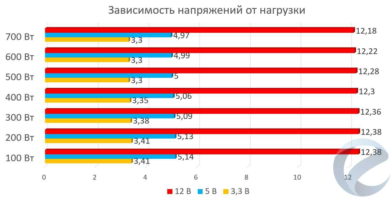 По требованиям стандарта ATX отклонение не должно превышать 5%. Таким образомнорма для линии +12 В лежит в пределах 11.4-12.6 В. Производитель заявляет отклонения напряжений не более 3%.