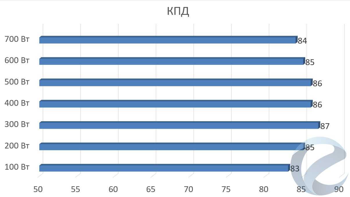 Не смотря на не самую лучшую сертификацию (помимо Bronze есть ещё Silver, Gold, Platinum и Titanium), КПД остаётся на высоком уровне, даже на пиковой нагрузке.