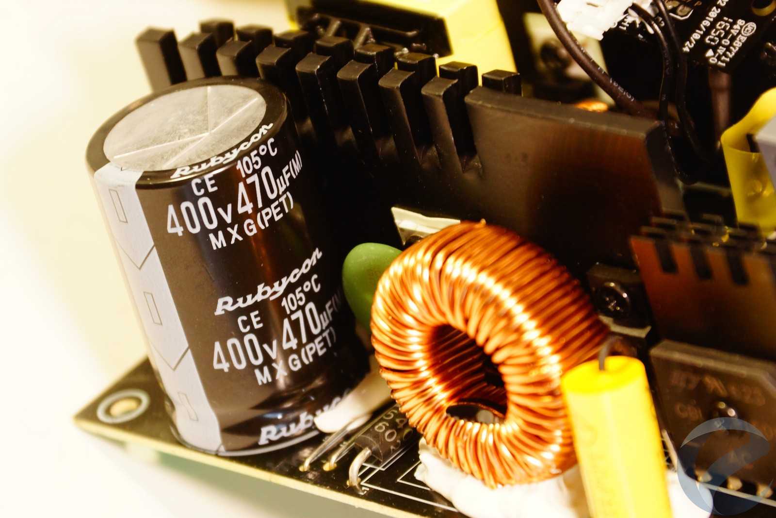В углу платы разместился сглаживающий конденсатор японского производства Rubycon емкостью 470 мкФ, рассчитанный на напряжение до 400 В и температуру до 105 °C. Этой емкости достаточно для БП данной мощности.