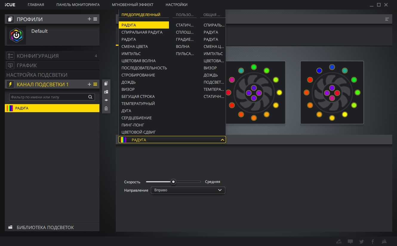 3. «Настройка подсветки» позволяет выбрать правильный тип и количество вентиляторов для корректной работы подсветки. Возможности в плане эффектов те же, что и в обзоре корпуса Corsair SPEC OMEGA-RGB. Эффектов много.
