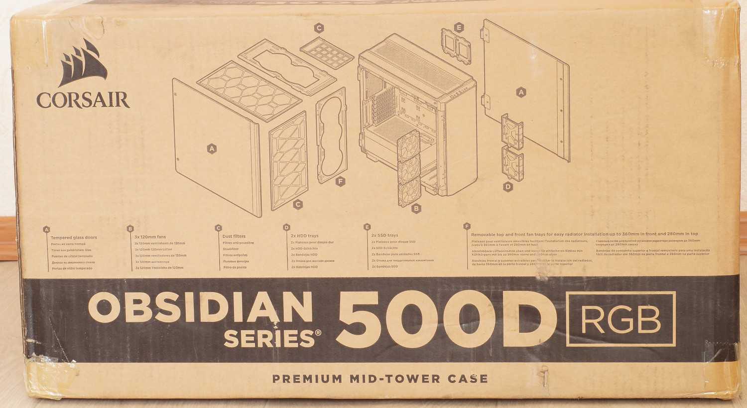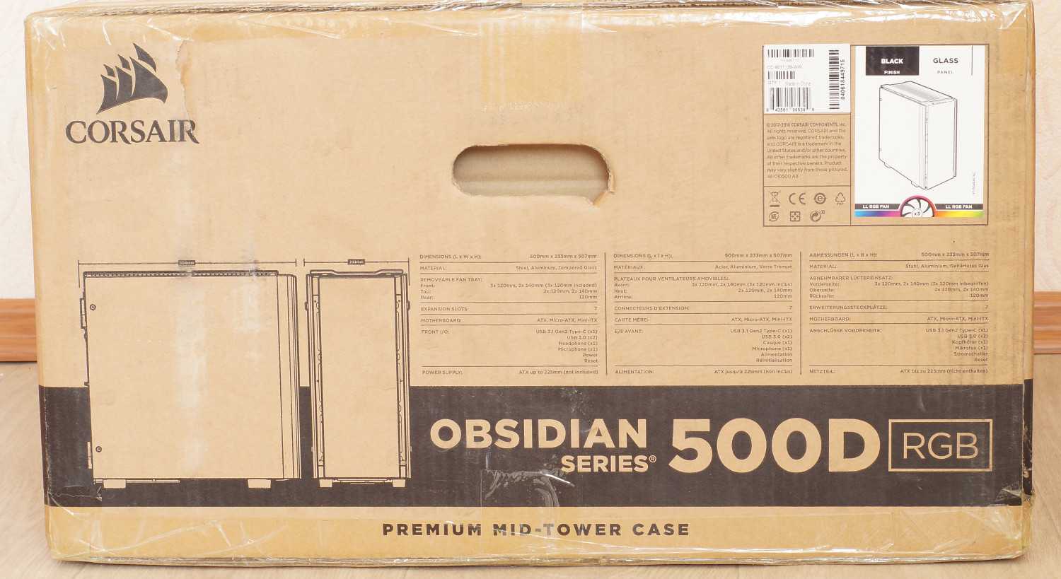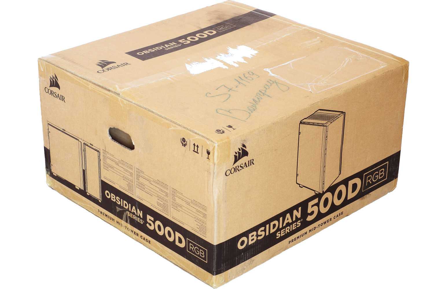 В первую очередь Mid-Tower корпус Corsair Obsidian 500D RGBсмог удивить своей крупной коробкой с выступами, ориентированными на горизонтальное перемещение. Но переносить 14 кг веса в ней будет не совсем приятно. С точки зрения оформления чем-то особенным коробка не выделяется – название модели, технические характеристики.