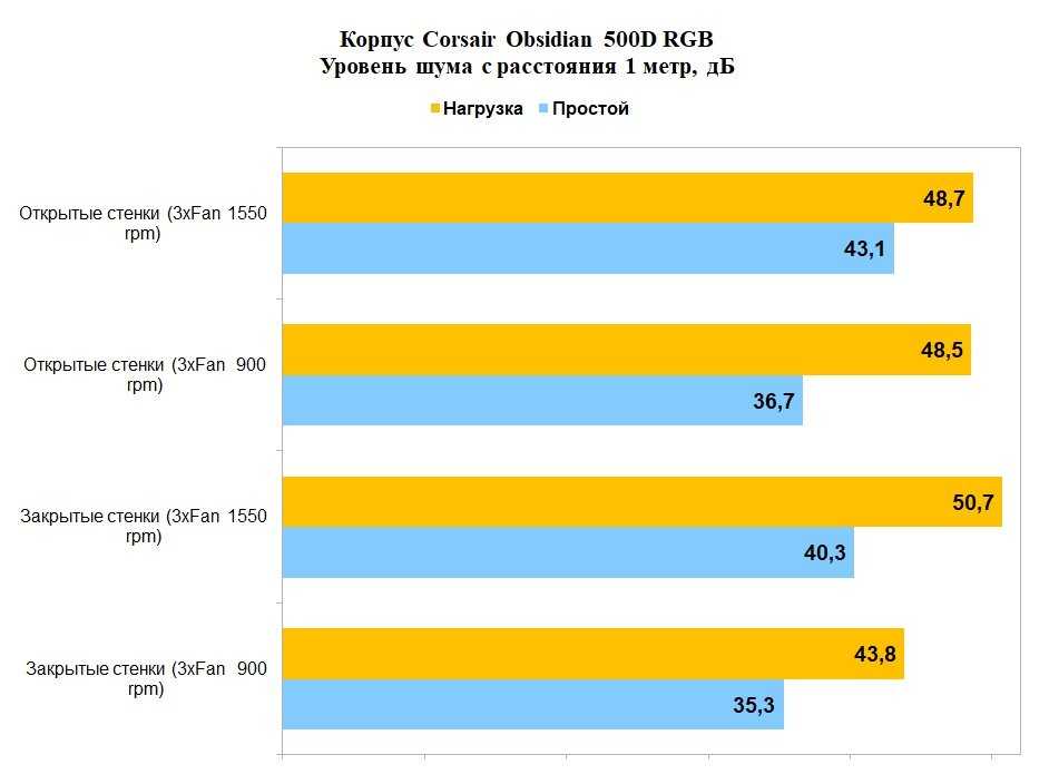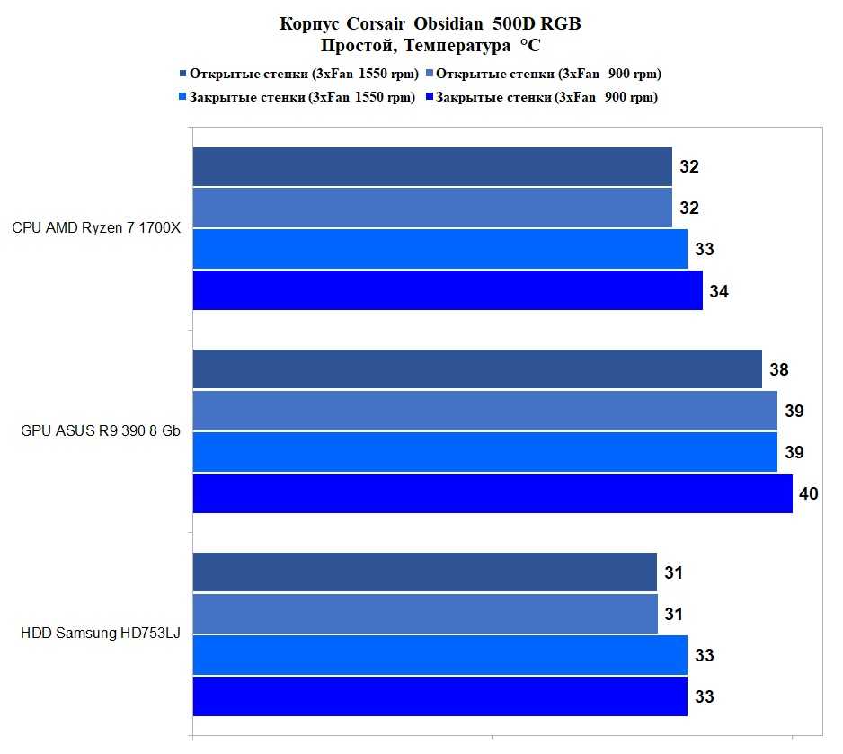 Если говорить о работе под нагрузкой, то обратим внимание на повышенный нагрев процессора и видеокарты в закрытом корпусе относительно открытого. Так, для процессорапри одинаковых оборотахона составляет 4 °С и 5 °С соответственно, для видеокарты – 4 °С