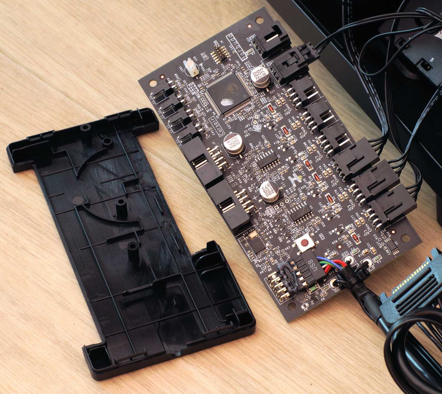 Однако неприятный момент был найден: блок подключения вентиляторов, датчиков буквально вывалился из корпуса при открытии стенки, причем в «разобранном» виде. Благо все удалось собрать, но на самом стекле внутри остались следы клейкой основы… Поэтому рекомендация: проверяйте содержимое перед покупкой.