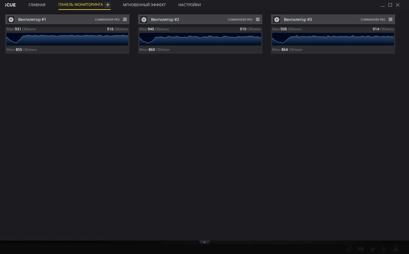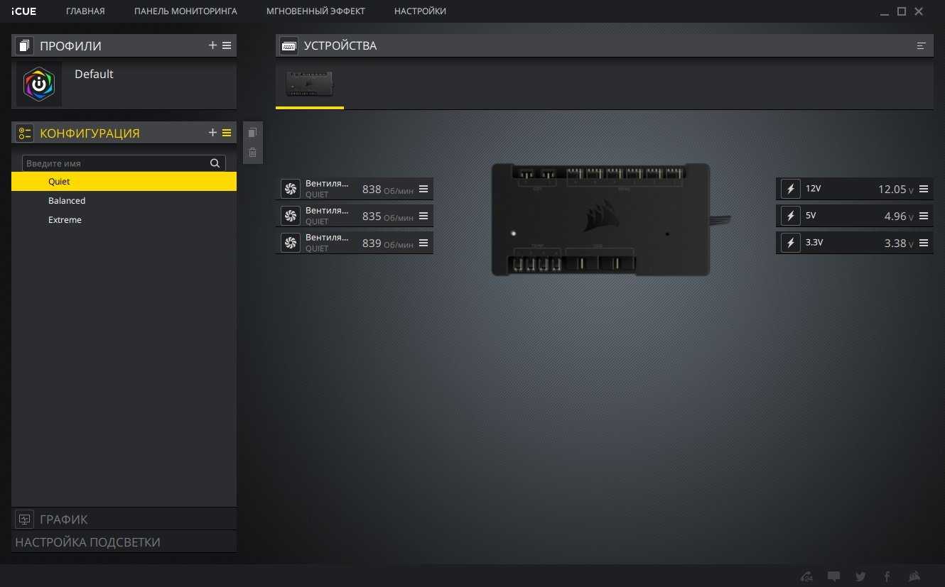 Для управления оборотами вентиляторов и их подсветкойв Mid-Tower корпусе Corsair Obsidian 500D RGB необходимо будет установить фирменную утилиту iCUE. После запуска в самой утилите появится устройство Commander Pro, которое и отвечает за работу всех элементов внутри корпуса. Интерфейс русскоязычный и простой. Настроек для данного устройства не так много: