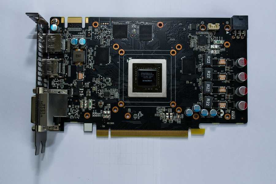Печатная плата выполнена в черном цвете. Видеокарта вместе с СО имеет длину всего 153 мм и ширину 111 мм, благодаря этому она подойдет практически в любые корпуса, даже HTPC. Четыре чипа памяти находятся на лицевой стороне, а остальные — на задней части. Не совсем удачное расположение, так как потоком воздуха от вентиляторов охлаждаются только те, что находятся под СО.