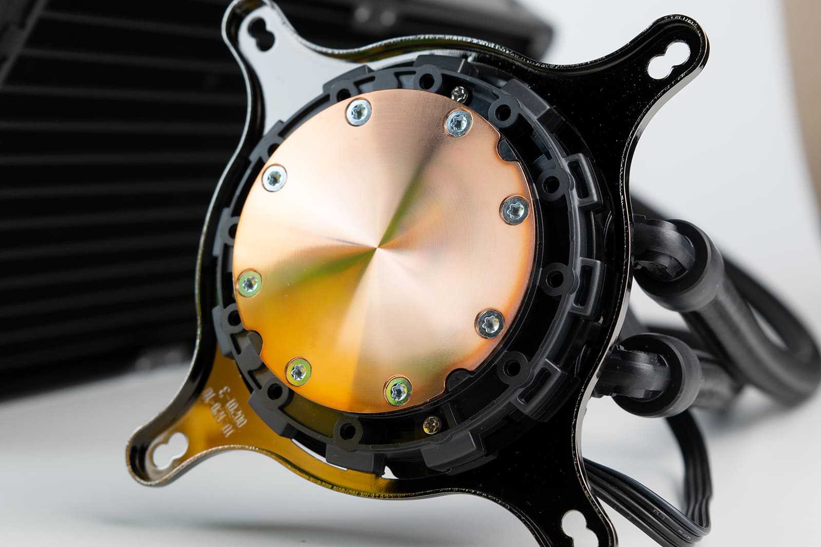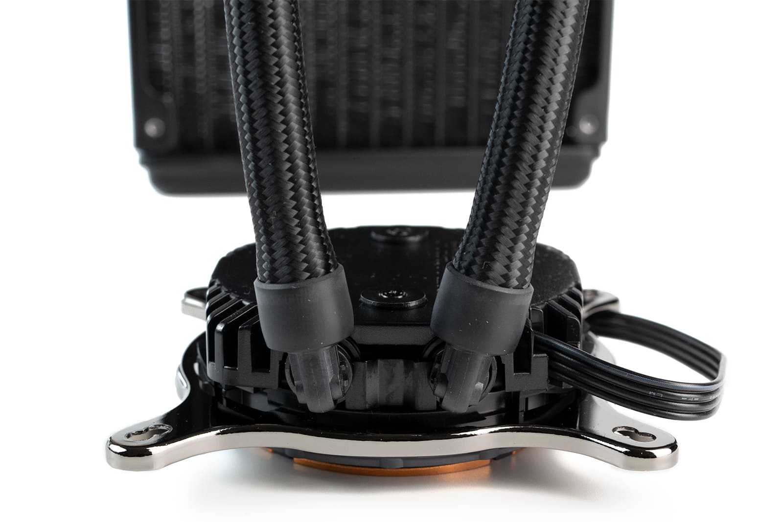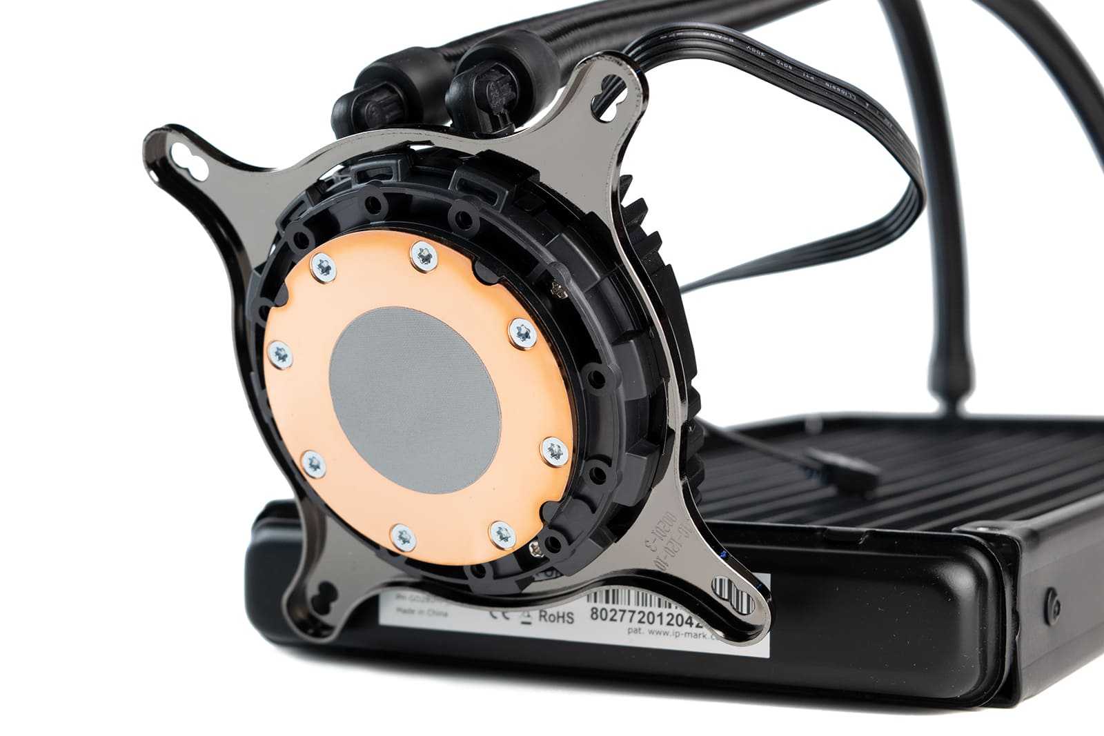 Водоблок совмещен с помпой 7 поколения производства Asetek, вращающейся на максимальной скорости в 2800 об/мин. Верхняя часть выполнена из пластика. На ней можно увидеть два магнита, необходимых для крепления декоративной крышки с подсветкой.