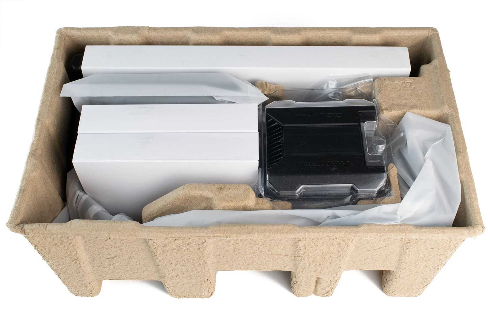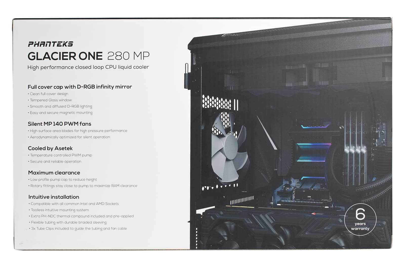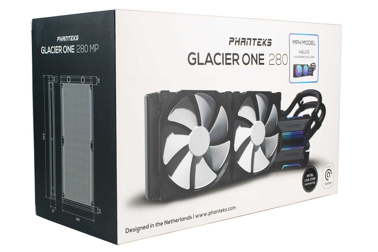 Поставляется GLACIER ONE 280 MPH в картонной коробке, оформленной в строгом стиле с применением черных и белых цветов. На фронтальной части нас встречает изображение системы охлаждения, а также наклейка, говорящая о наличии дополнительной подсветки вентиляторов. Помимо этого указывается поддержка сокета LGA 1700.