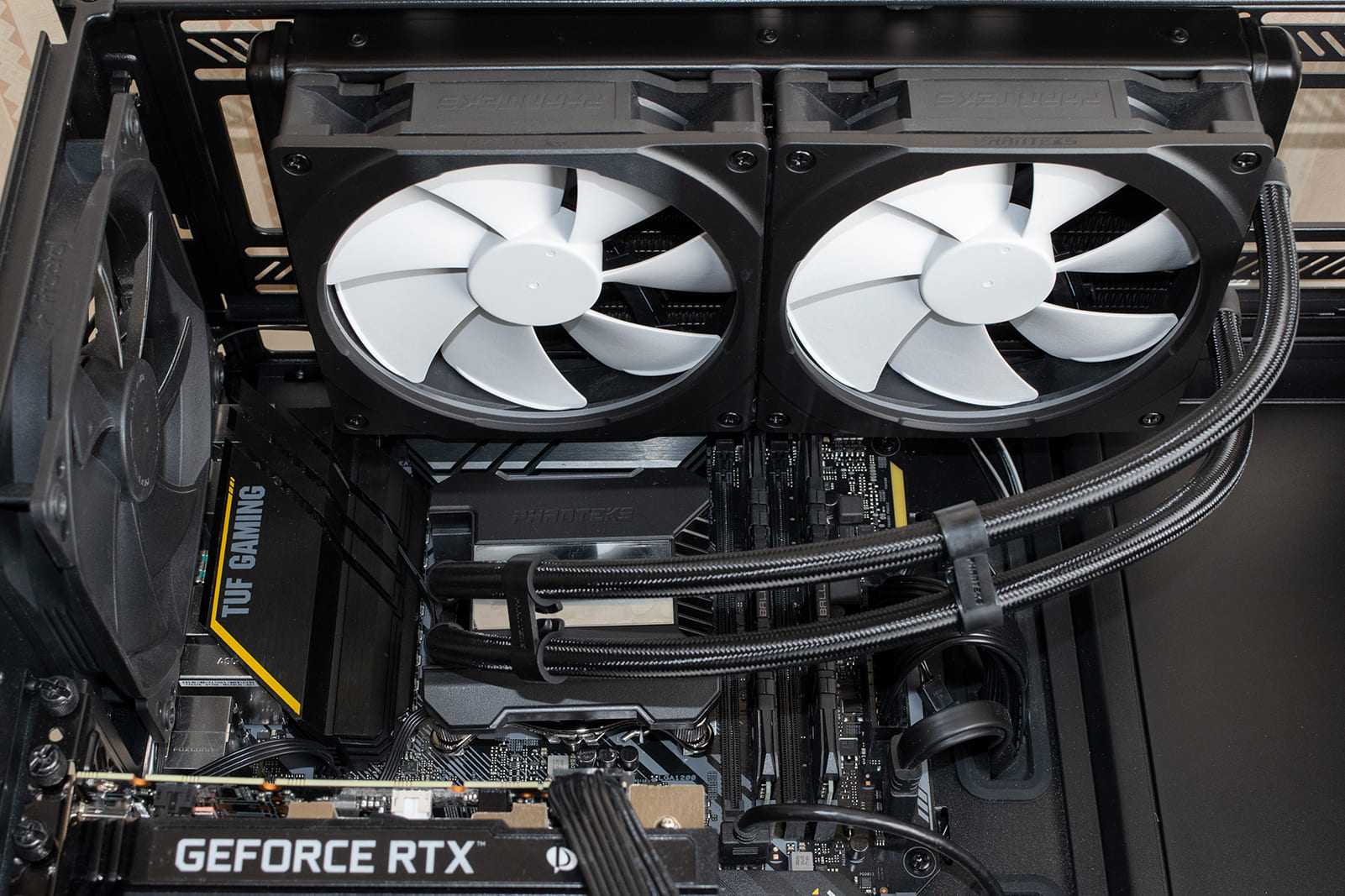 Вся система в сборе выглядит лаконично и стильно. Крышка водоблока закрывает все крепежные элементы, что благоприятно сказывается на внешнем виде. Однако в тестовой системе произошел конфликт с оперативной памятью: рамки с подсветкой упирались в радиаторы, что не позволяло должным образом зафиксировать радиатор в корпусе. Этот момент стоит учитывать при сборке, так как допустимая толщина СЖО будет индивидуальна в каждом конкретном случае.
