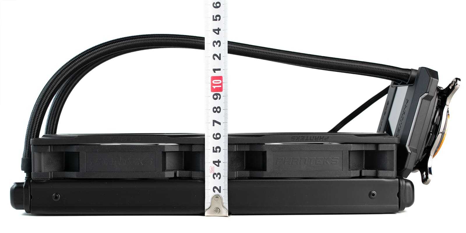 Толщина радиатора составляет стандартные 27 мм, еще 25 мм добавляют вентиляторы. Если же пользователь захочет установить подсветку, то общая толщина системы охлаждения составит внушительные 62 мм. Потому стоит ожидать конфликта с радиаторами материнских плат и оперативной памяти при установки СЖО наверх некоторых корпусов.