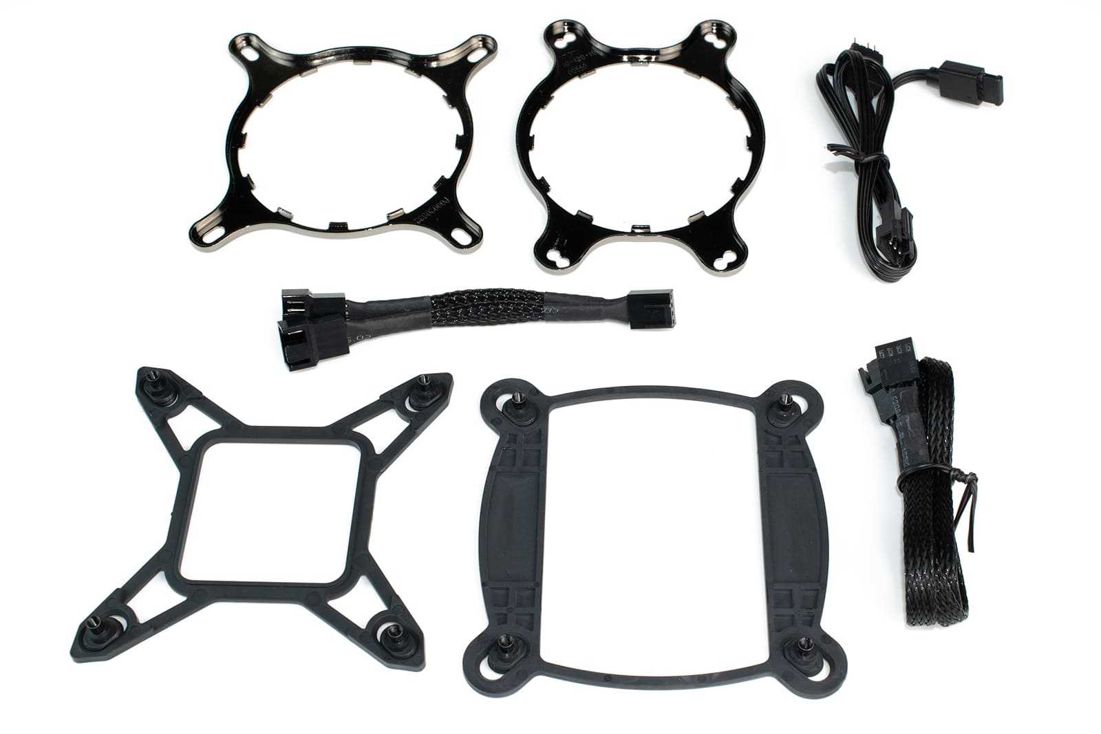 Помимо вышеупомянутого, в комплекте находятся пластиковые бэкплейты, кронштейны для установки водоблока на различные сокеты, Y-образных разветвитель для подключения вентиляторов и помпы к одному разъему на материнской плате, 50 см удлинитель для подключения вентиляторов и разветвитель для подключения подсветки. К сожалению, места для отдельного ARGB контроллера не нашлось.