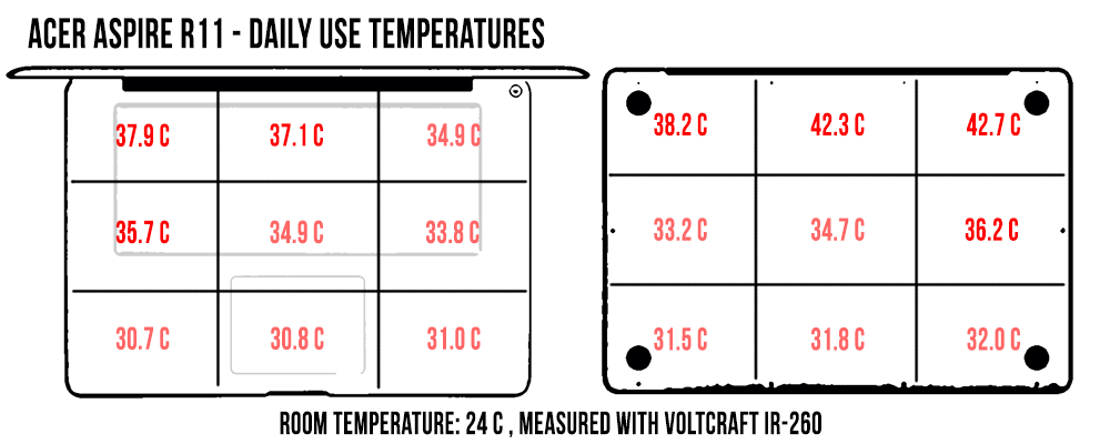 In daily use the laptop’s back often goes above 35 degrees Celsius, which is not that bad for a fanless platform, but at the same time barely makes this hybrid comfortable to use on your lap in these hot summer days. Barely! Daily use means browsing, watching videos and so on.
