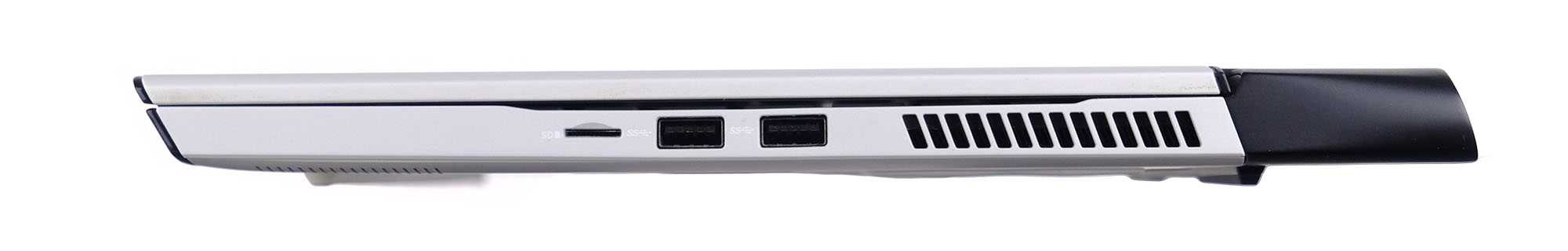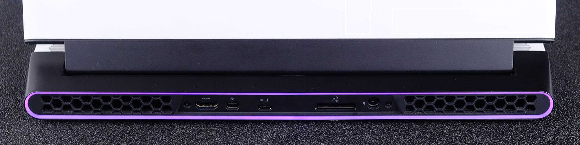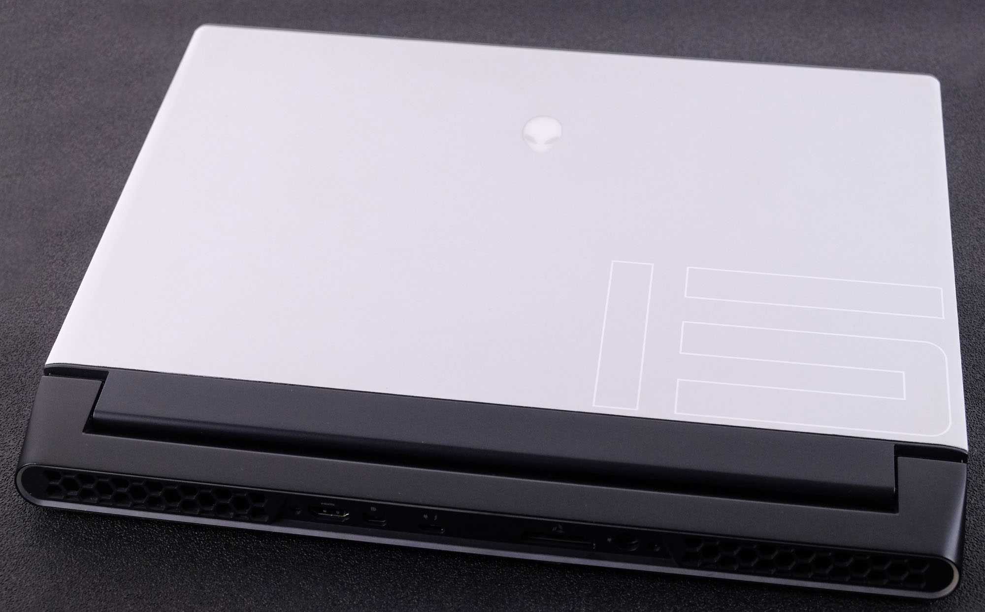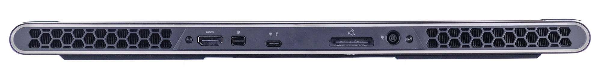 Выброс горячего воздуха осуществляется через крупные решётки на заднем торце и решётки по бокам корпуса. Также сзади расположена часть разъёмов. Здесь подключается питание DC, а также есть HDMI 2.0b, mini-DisplayPort 1.4, порт графического ускорителя Alienware и USB 3.2 Gen1 Type-C, совмещенный с Thunderbolt 3.