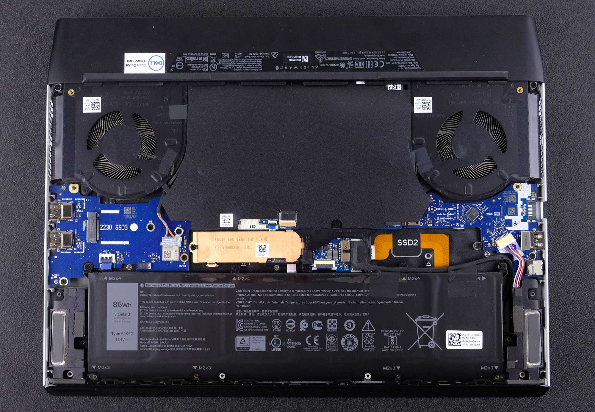 Под панелью скрывается встроенный аккумулятор на 86 Вт⋅ч и система охлаждения с двумя турбинами увеличенной эффективности (на 25 % больше лопастей, всего — 132 лопасти) и испарительной камерой (расположена под материнской платой). Оперативная память распаяна, так что увеличить её объём не выйдет, а вот для увеличения памяти накопителей доступно сразу 3 слота: два M.2 2280 и один для M.2 2230. На установленном диске M.2 присутствует медный радиатор.