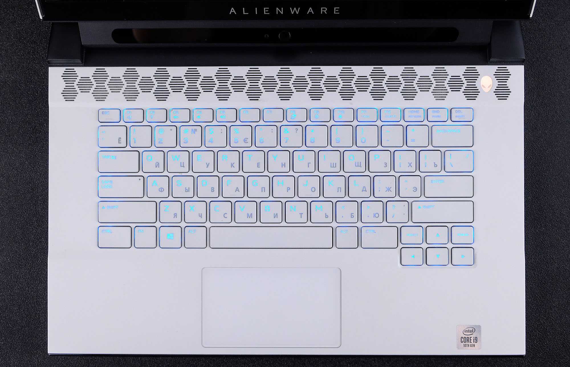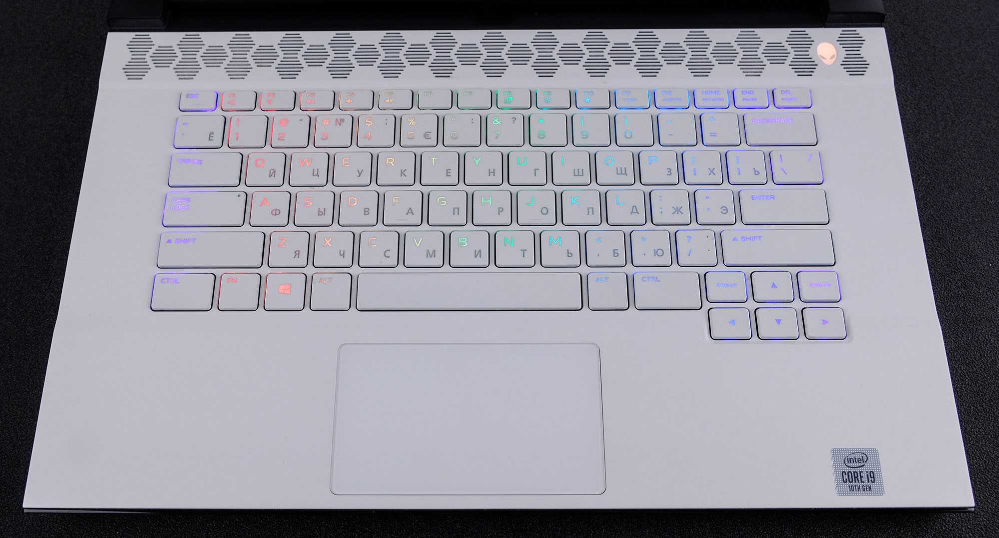 Топкейс у DELL Alienware m15 R3 имеет специальное покрытие — High Endurance Clear Coat, оно очень напоминает софт-тач пластик. На данном покрытии совсем не остаются следы от пальцев, плюс оно очень приятное на ощупь. По верхней части рабочей области идёт дополнительная решётка для поступления воздуха в СО. Клавиатура расположена на одном уровне с панелью топкейса. Ход клавиш здесь слегка увеличен (1,7 мм), а раскладка лишена цифрового блока, что позволило сделать её более комфортной. Стрелки здесь смещены чуть вниз и почти нормального размера. Кнопка включения в виде фирменного Алиена имеет подсветку и вынесена отдельно в правый угол.