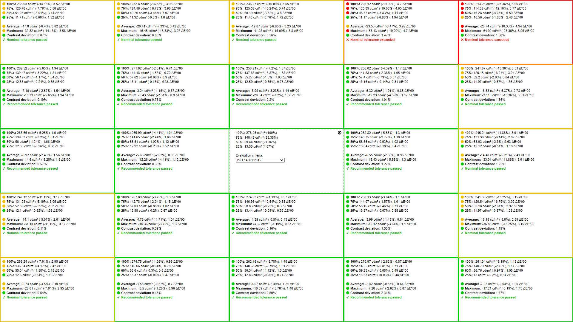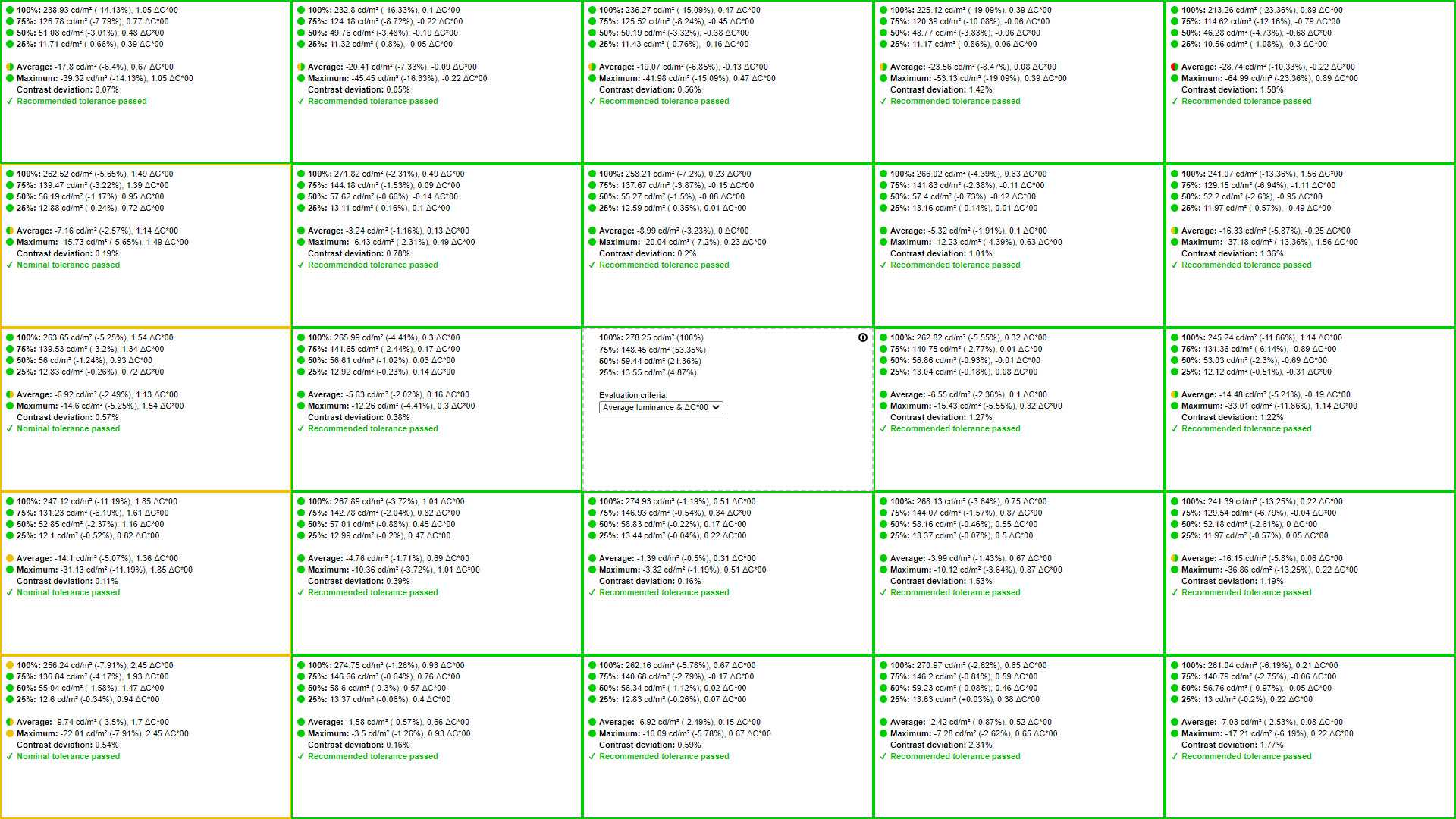Тестирование на однородность яркости подсветки дисплея обнаружило небольшой провал в правом верхнем углу экрана и вдоль краёв, если оценивать по критерию ΔС*00. Для стандарта ISO 14861:2015 проблем практически нет, отклонения в пределах нормы.