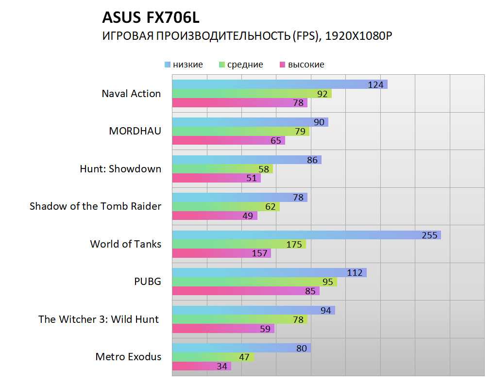 В играх положение вполне хорошее для бюджетного игрового лэптопа – разрешение FHD прощает начальный уровень видеокарты, и GTX 1650 Ti в целом неплохо справляется. В среднем в протестированных играх FPS держался на уровне 50-60 кадров при высоких настройках постобработки, кроме METRO EXODUS. Но даже и здесь мы видим 34 FPS и вполне играбельные 47 FPS при средних настройках.
