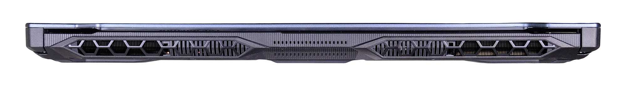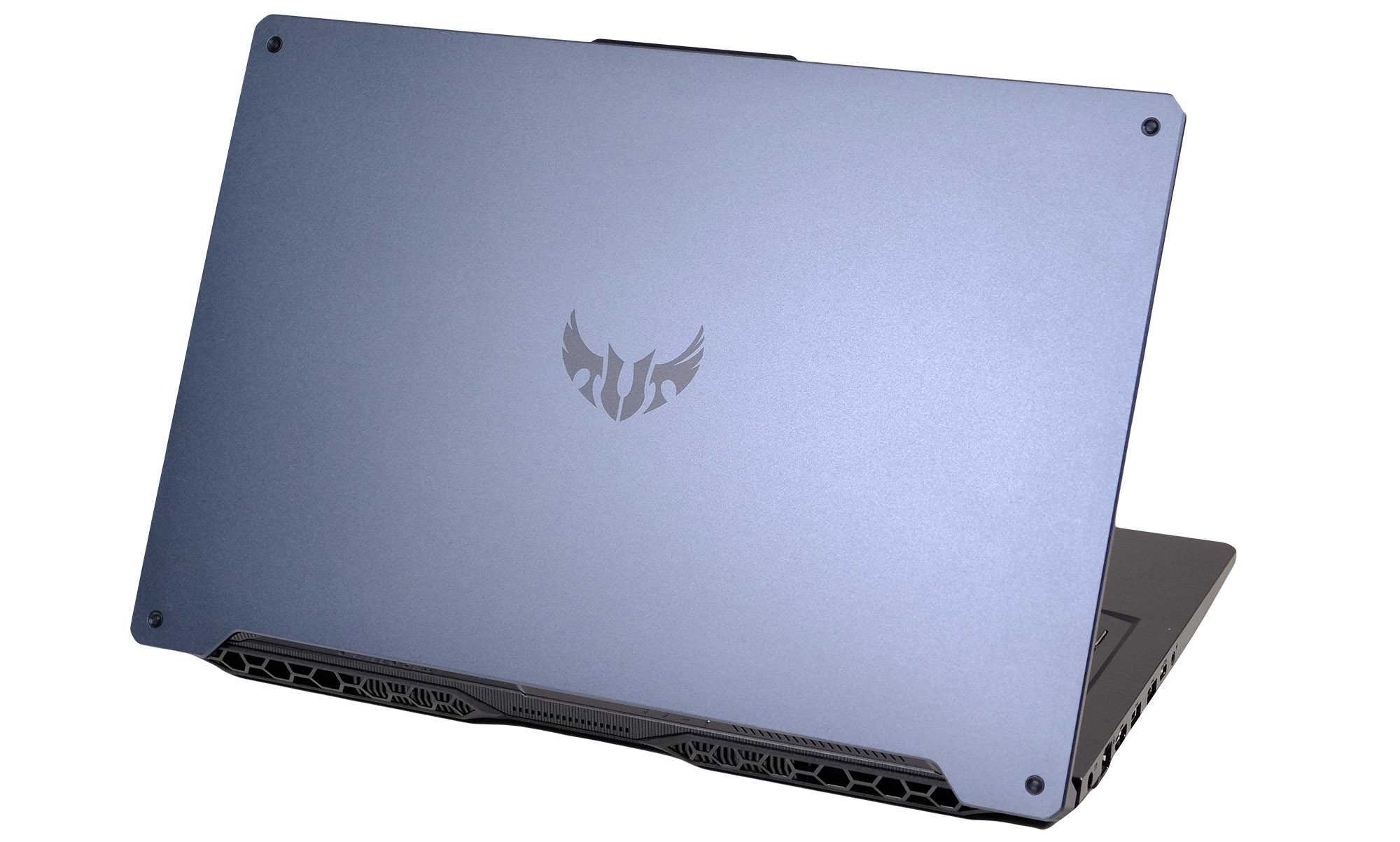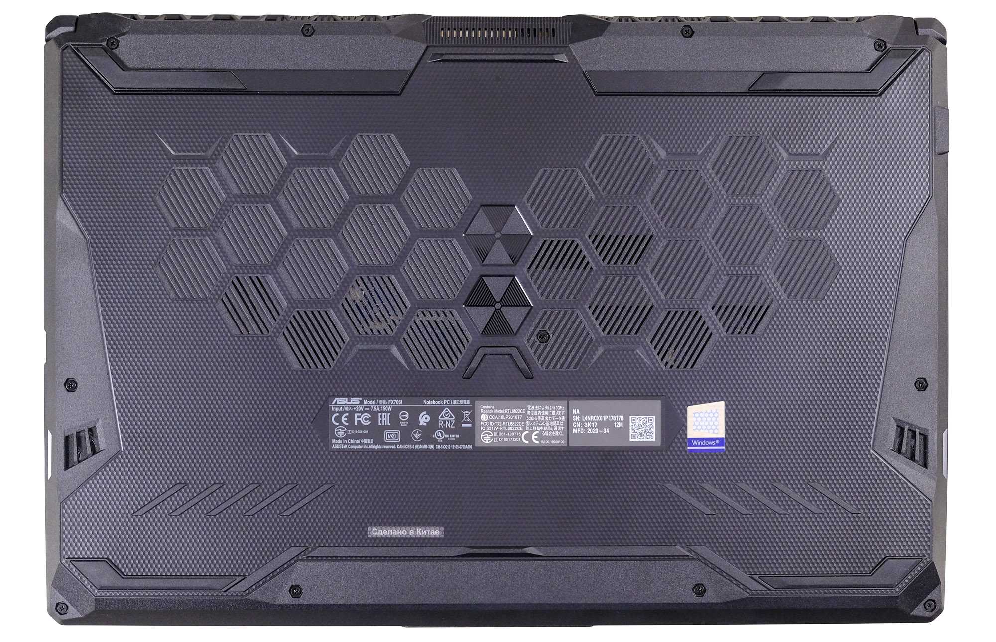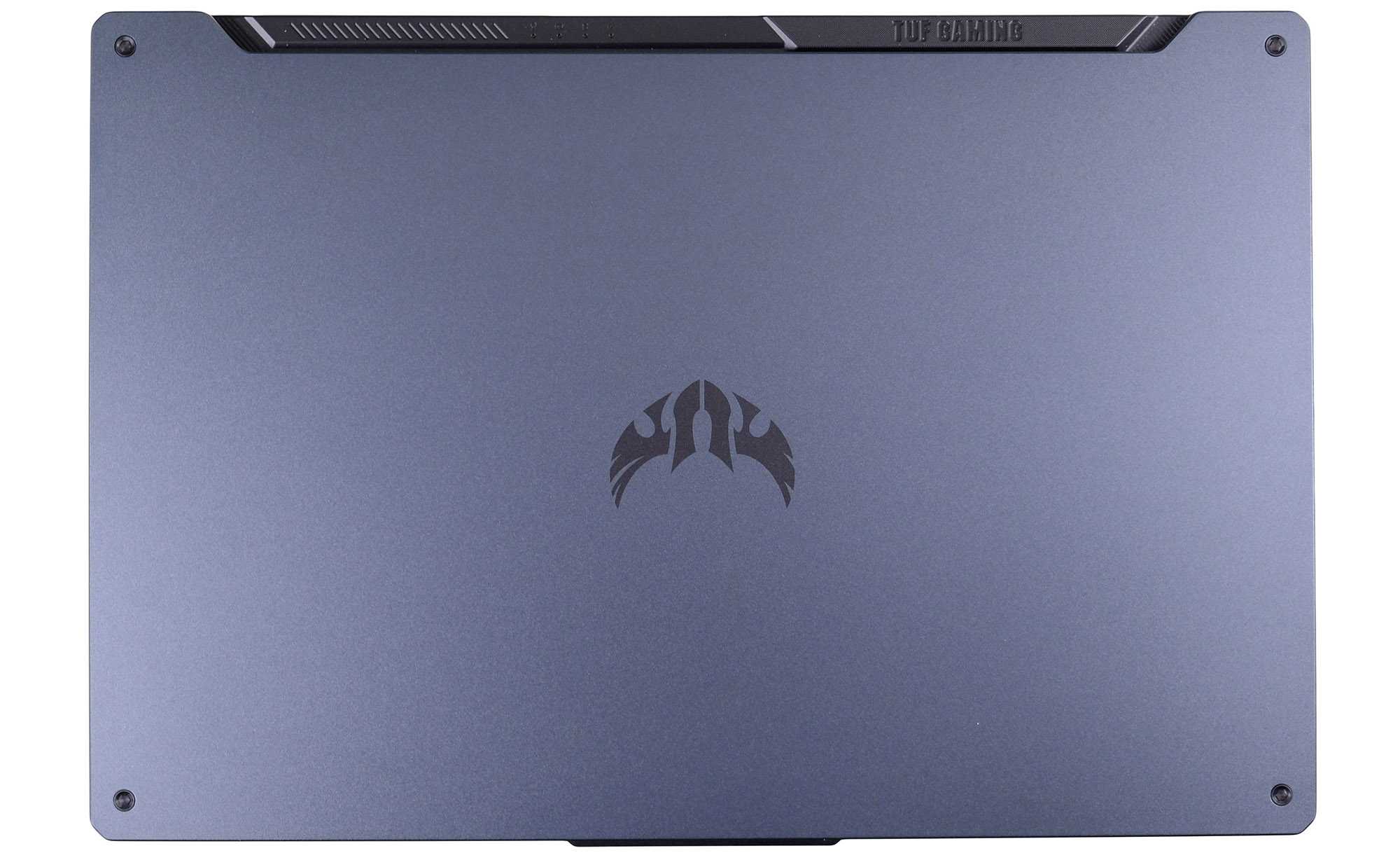Дизайн получился с уклоном в «октогональность»: углы срезаны, на всём корпусе прослеживаются правильные многоугольники, решётки выполнены в виде сот. Крышка имеет матовое серо-голубое покрытие с логотипом серии TUF по центру. Есть удобный зацеп для открытия крышки, но одной рукой полностью раскрыть ноутбук не получится.