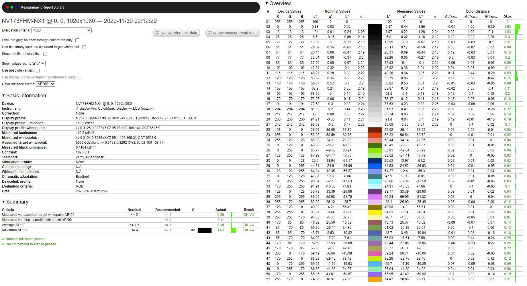 При этом расширенный тест на отображение оттенков дисплей прошёл хорошо, так что в калибровке особой нужды нет. Максимальное отклонение цвета в пределах нормы — 1,63 ΔE*00.