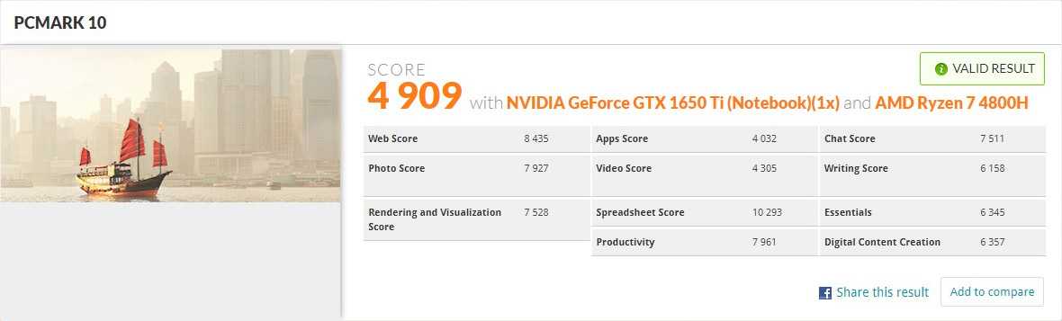 PCMark показывает уже более приятные результаты, если сделать скидку на не самую быструю дисковую систему и 16 ГБ оперативной памяти. Это однозначно заслуга Ryzen 7 4800H.