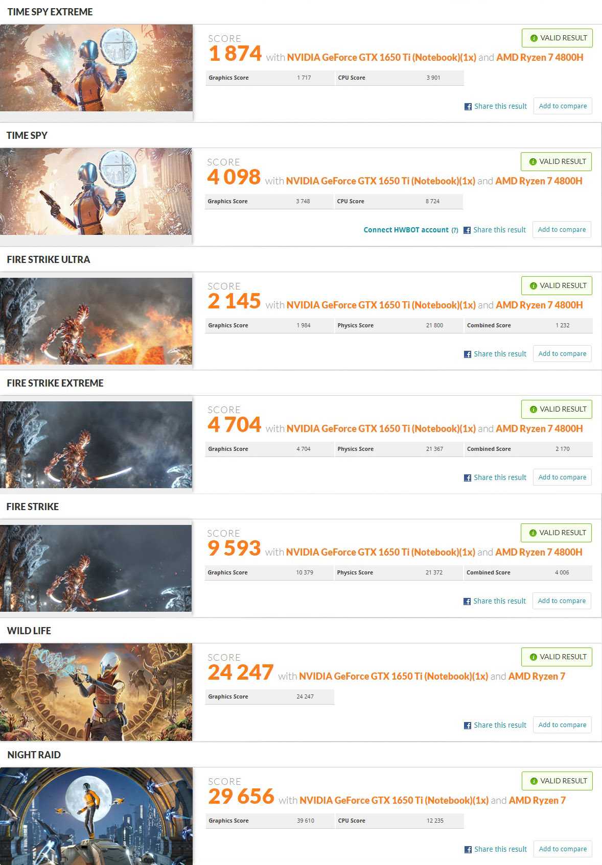 Начнём с комплекса тестов 3DMark, показавших неплохие, но достаточно скромные в целом результаты, что и ожидалось для GTX 1650 Ti.