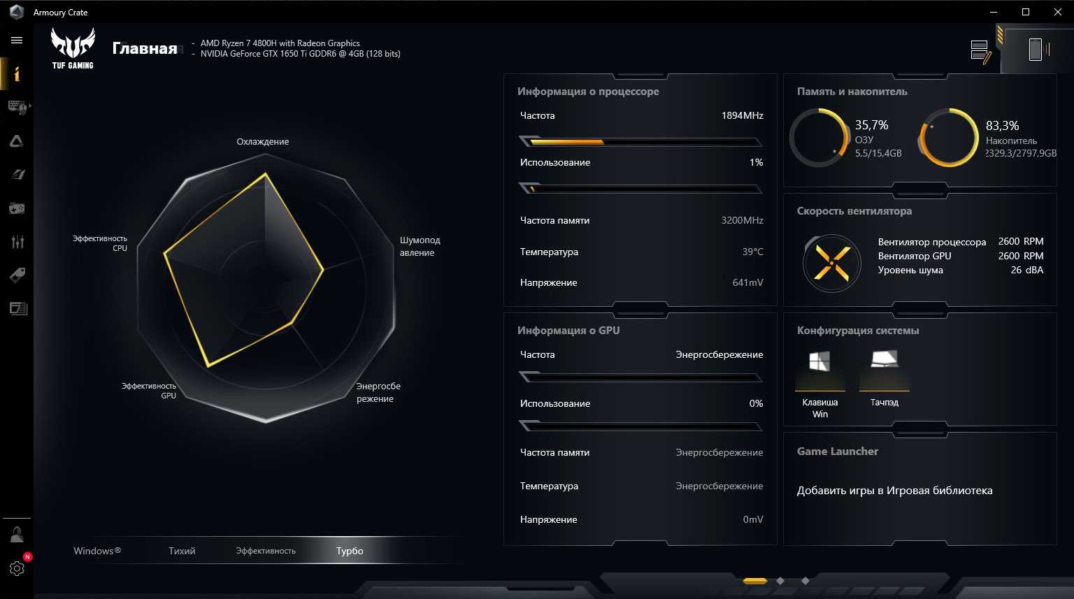 Модель TUF FX706l традиционно для игрового ноутбука ASUS может функционировать в трёх основных режимах: тихий, эффективный и турбо-режим.