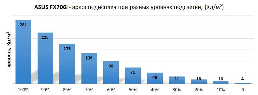 Замеры яркости показали максимальное значение всего 281 Кд/м2, что совсем немного – при ярком освещении дисплей будет слепнуть. Регулировка уровней подсветки достаточно плавная на всём диапазоне.