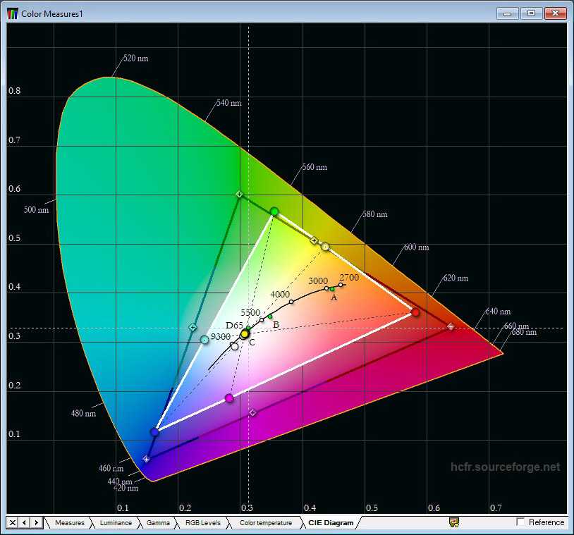 Ситуацию хорошо иллюстрирует полученный треугольник охвата на фоне референсной области sRGB. Вершины слегка выходят за пределы области.