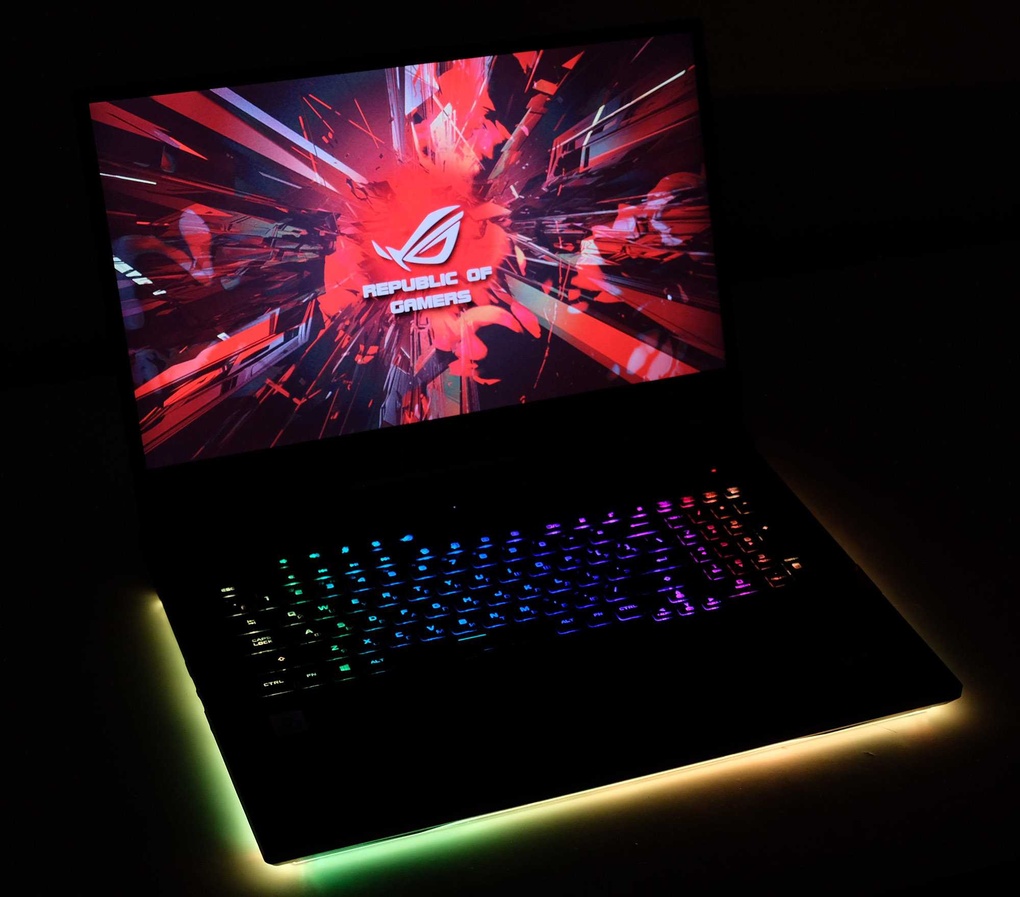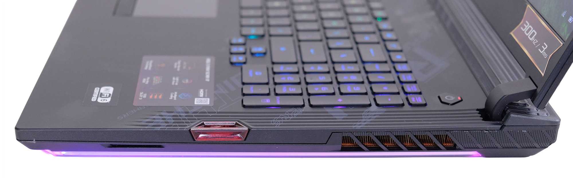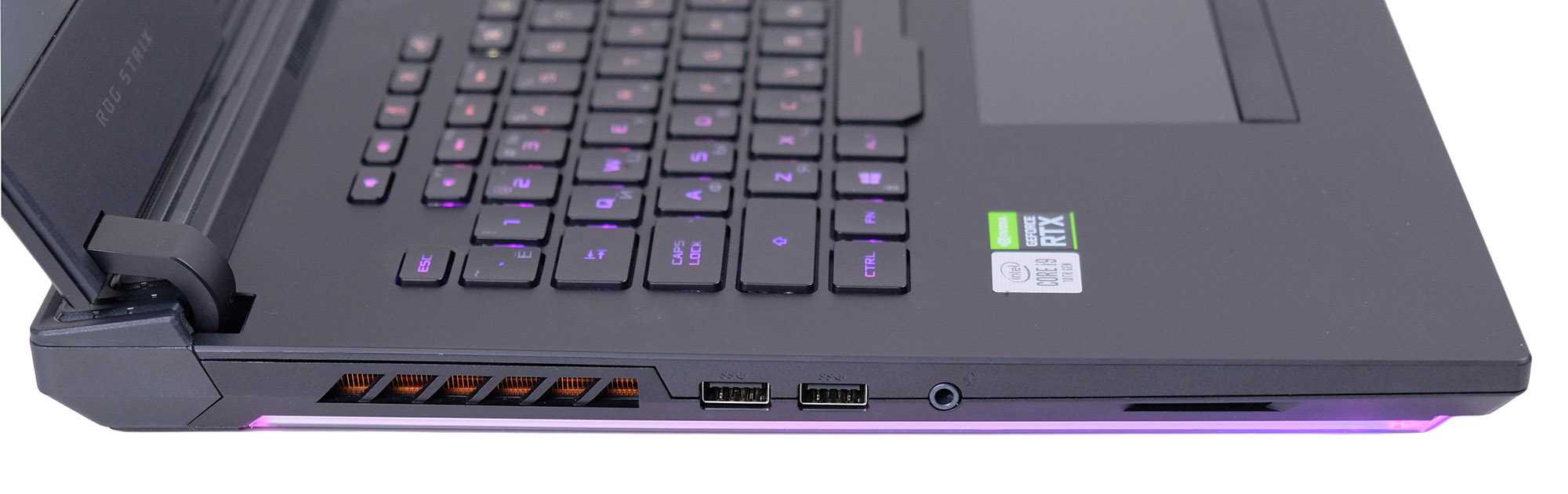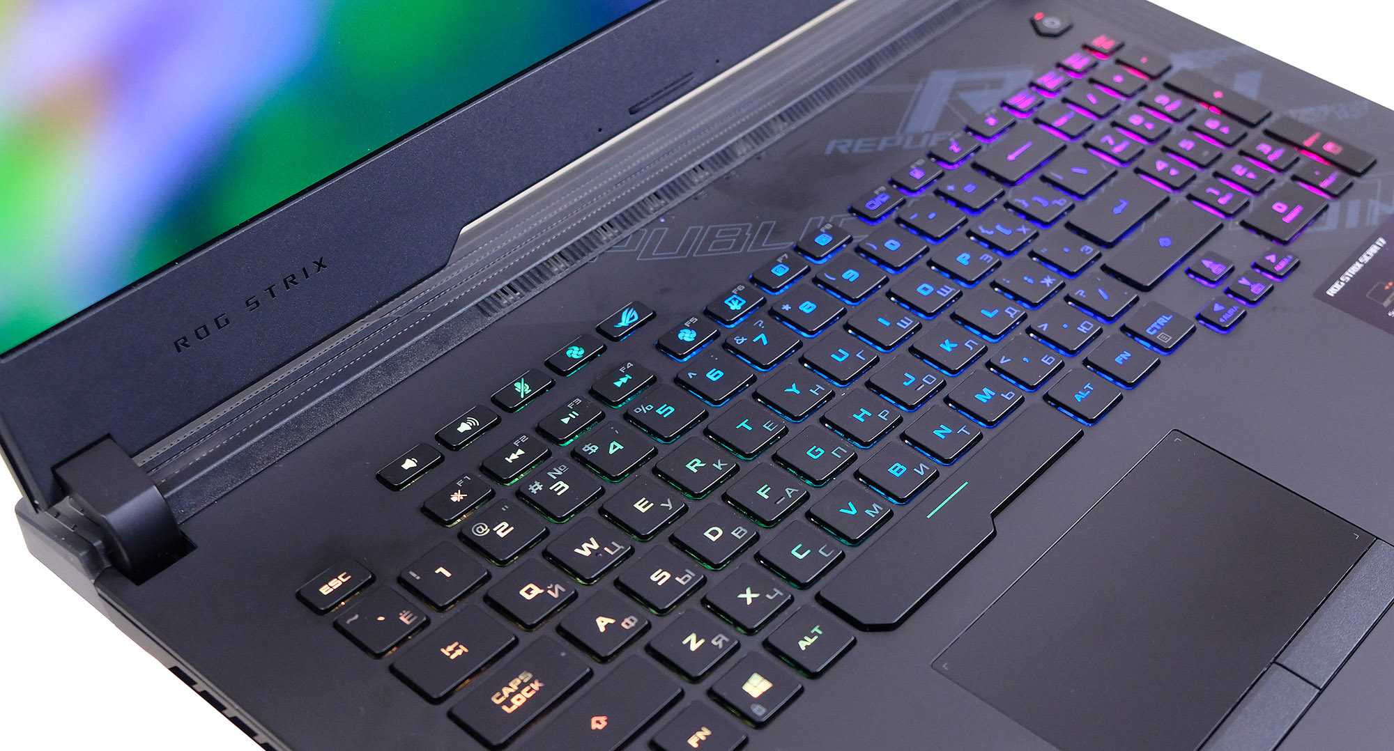 Как вы увидите на наших фотографиях, Strix Scar 17 очень хорошо совместим с RGB. Есть управление освещением через совместимую с Aura Sync световую полосу внизу, логотип на крышке, а также подсветку экрана.