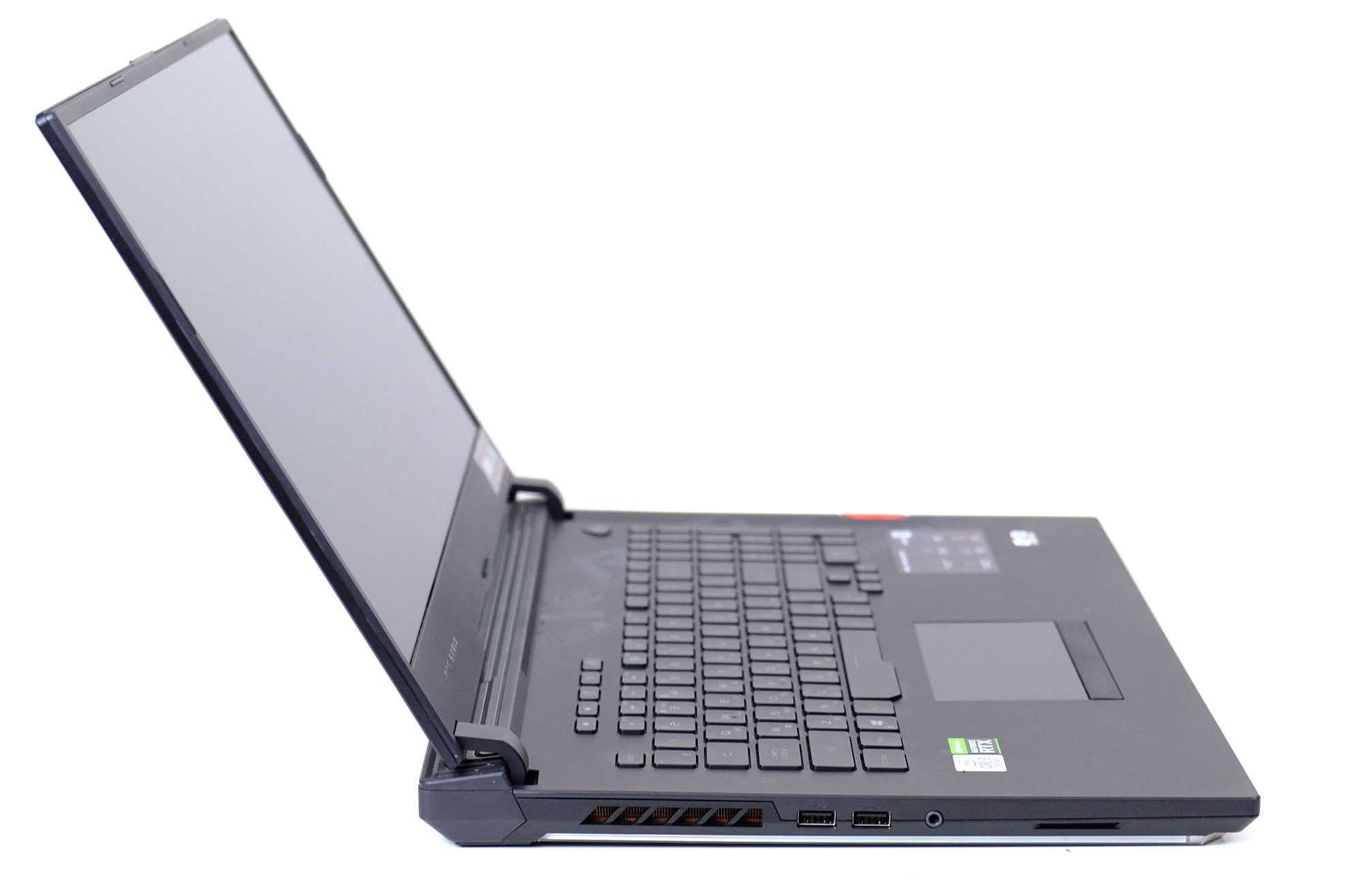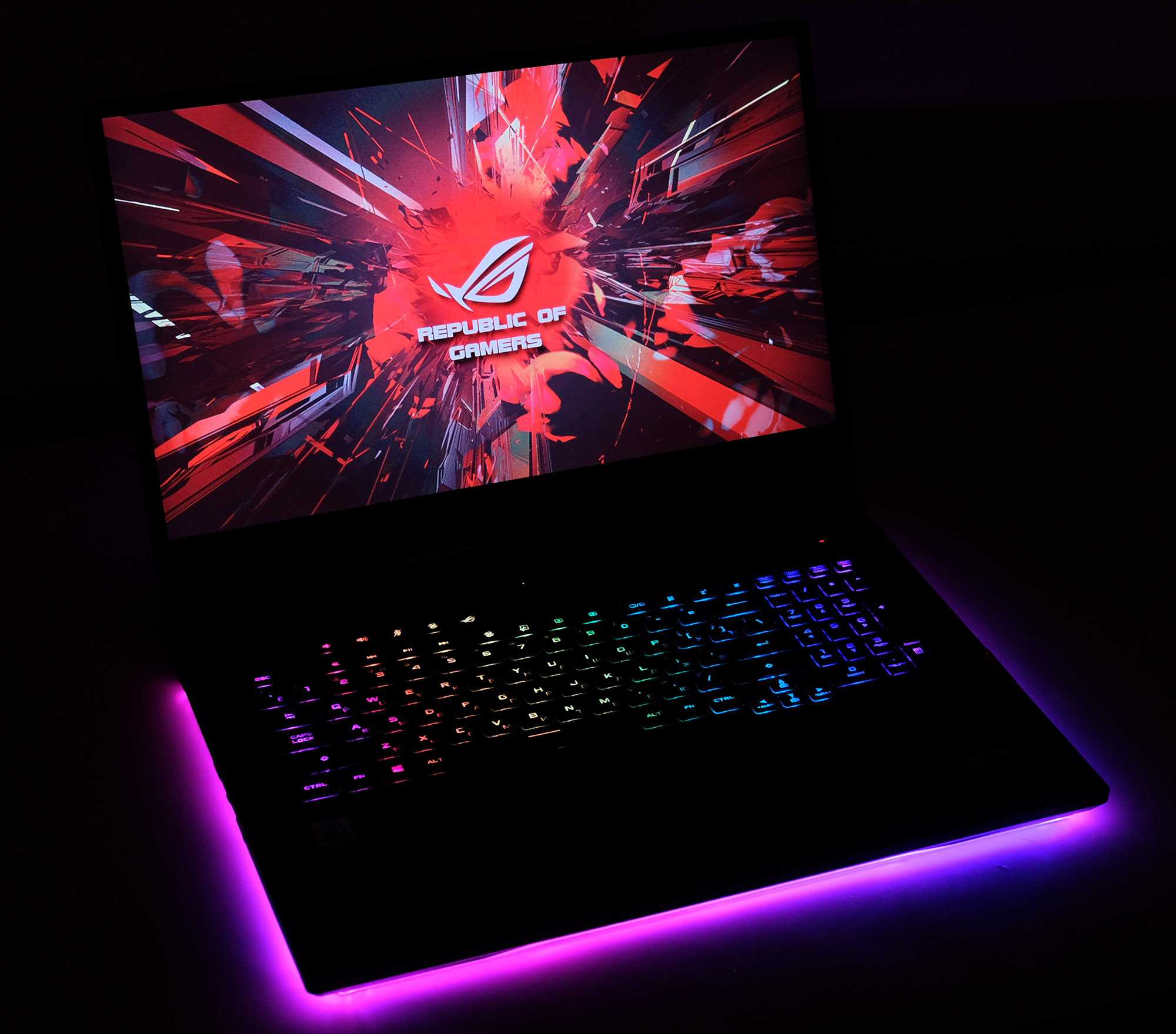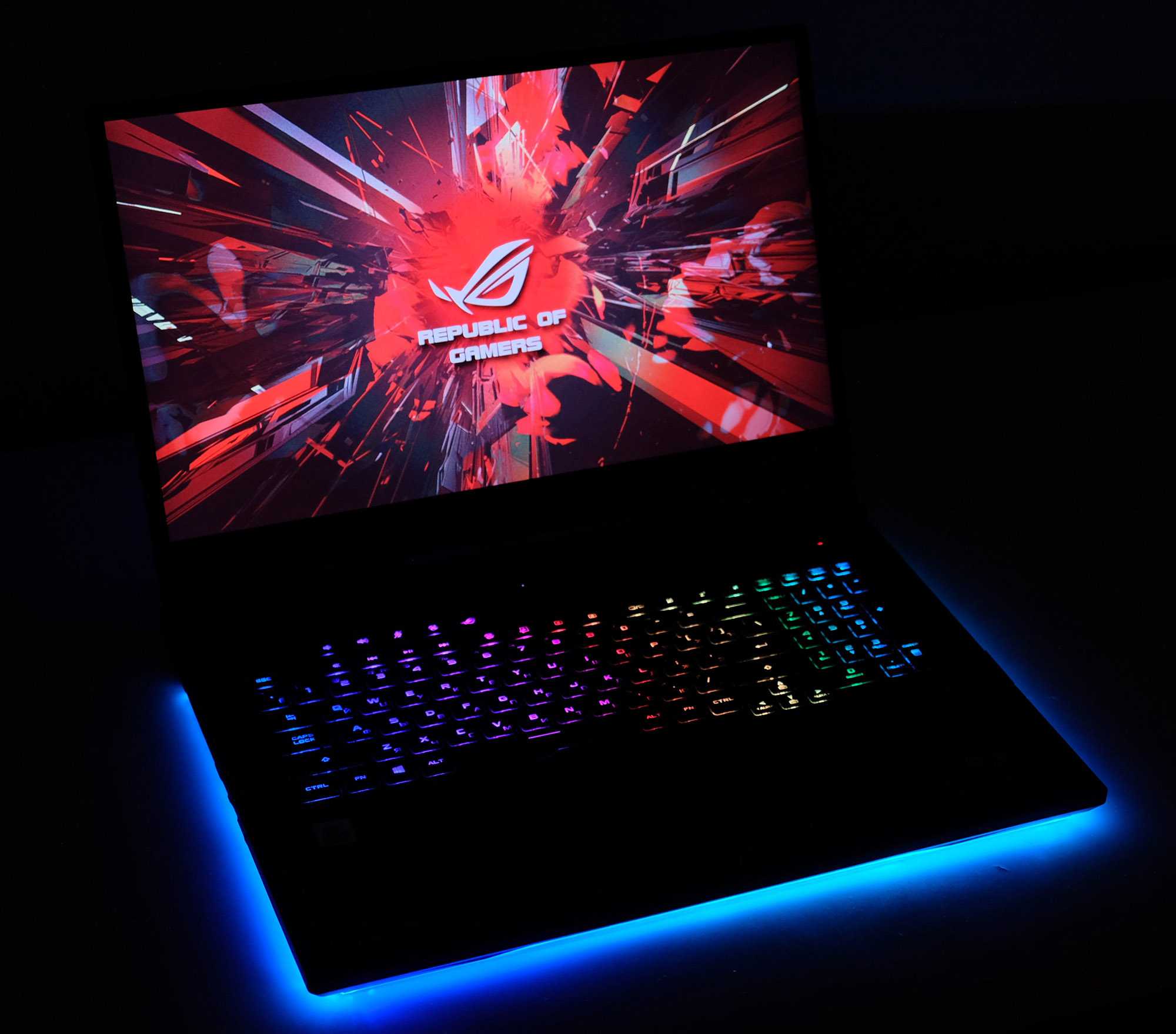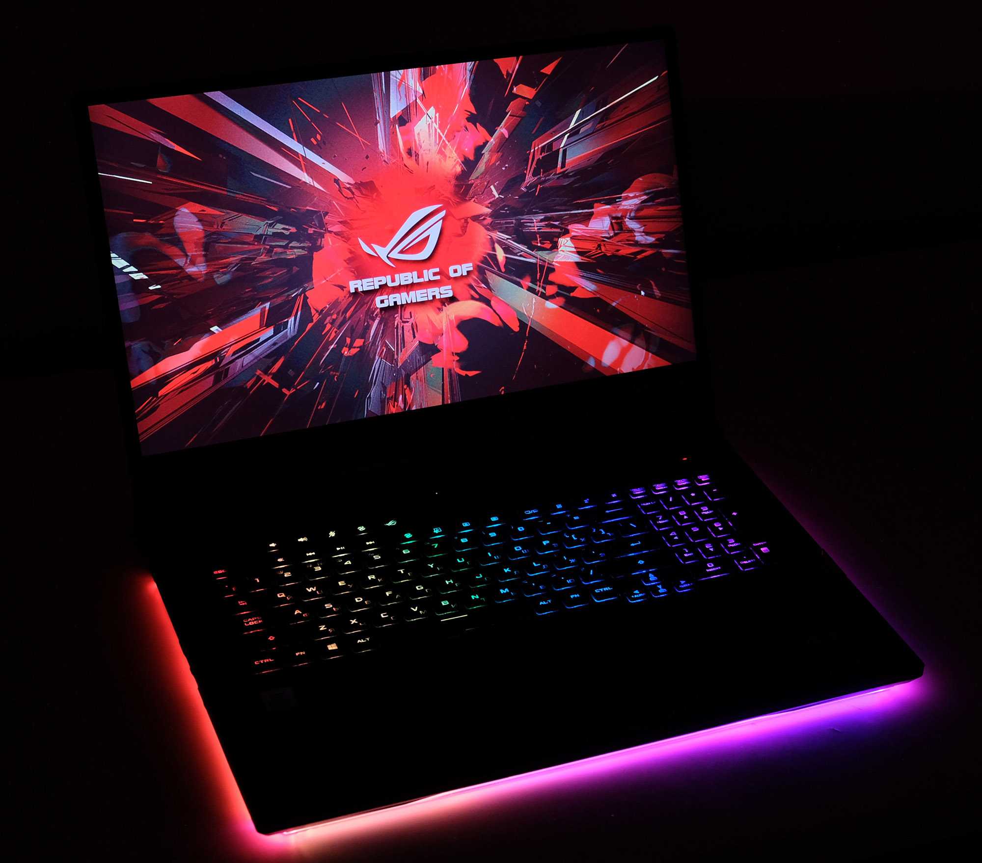 Как вы увидите на наших фотографиях, Strix Scar 17 очень хорошо совместим с RGB. Есть управление освещением через совместимую с Aura Sync световую полосу внизу, логотип на крышке, а также подсветку экрана.
