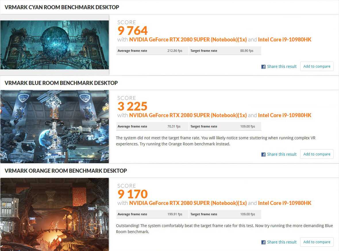 Высокие показатели достигнуты и в бенчмарках VRMark, так что ноутбук вполне готов и для 3D.