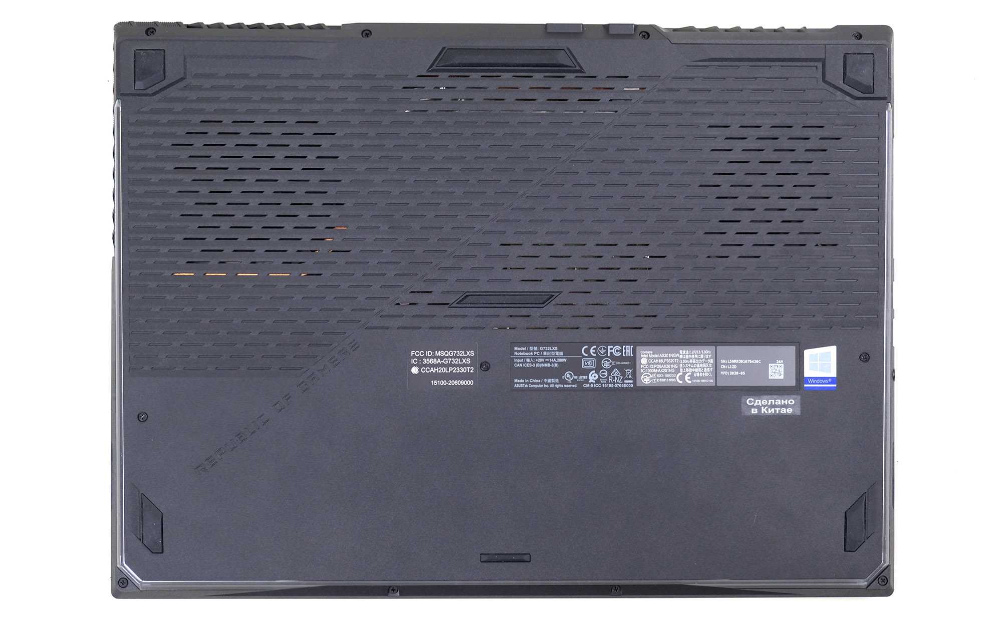 Strix Scar 17 G732LXS идеально вписывается в стандарты игровой линейки ASUS ROG: графитный металлический матовый корпус, достаточно агрессивный дизайн со стилизованной выступающей решёткой отвода воздуха, акцентом в виде ломаной полосы на крышке и логотипа с подсветкой. При диагонали дисплея 17,3” габариты ноутбука примерно средние по группе — 399 x 293 x 27.9 мм, вес достаточно большой — почти 3 кг.